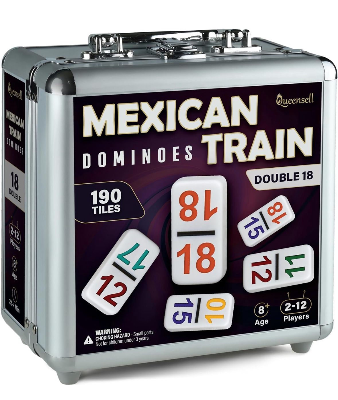 Queensell Mexican Train Dominoes Set with Numbers - Double 18 Dominos Set for Adults and Kids - Mexican Dominoes Train Game Night Games for Adults with Wooden Hub and Aluminum Case