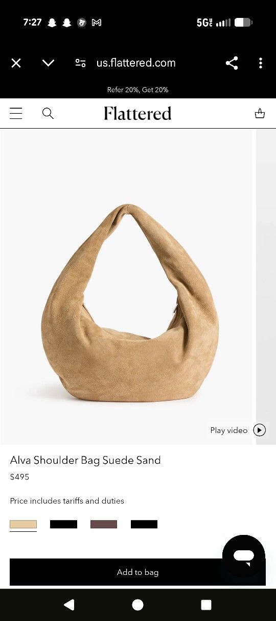 Design: A slouchy, zip-top hobo silhouette with an integrated shoulder strap. Materials: Crafted from Italian calf suede with a lining made of a recycled cotton blend (20% recycled cotton, 80% cotton). Origin: Designed in Stockholm and handmade in Italy. Price: Typically retails for $495. Care: Suede is delicate; it is recommended to use a protective spray regularly and avoid contact with dark or dyed materials.