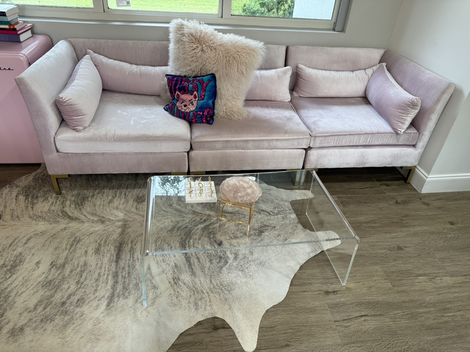 Light pink sectional includes 3 pieces and standard pillows. Excellent condition. Price firm