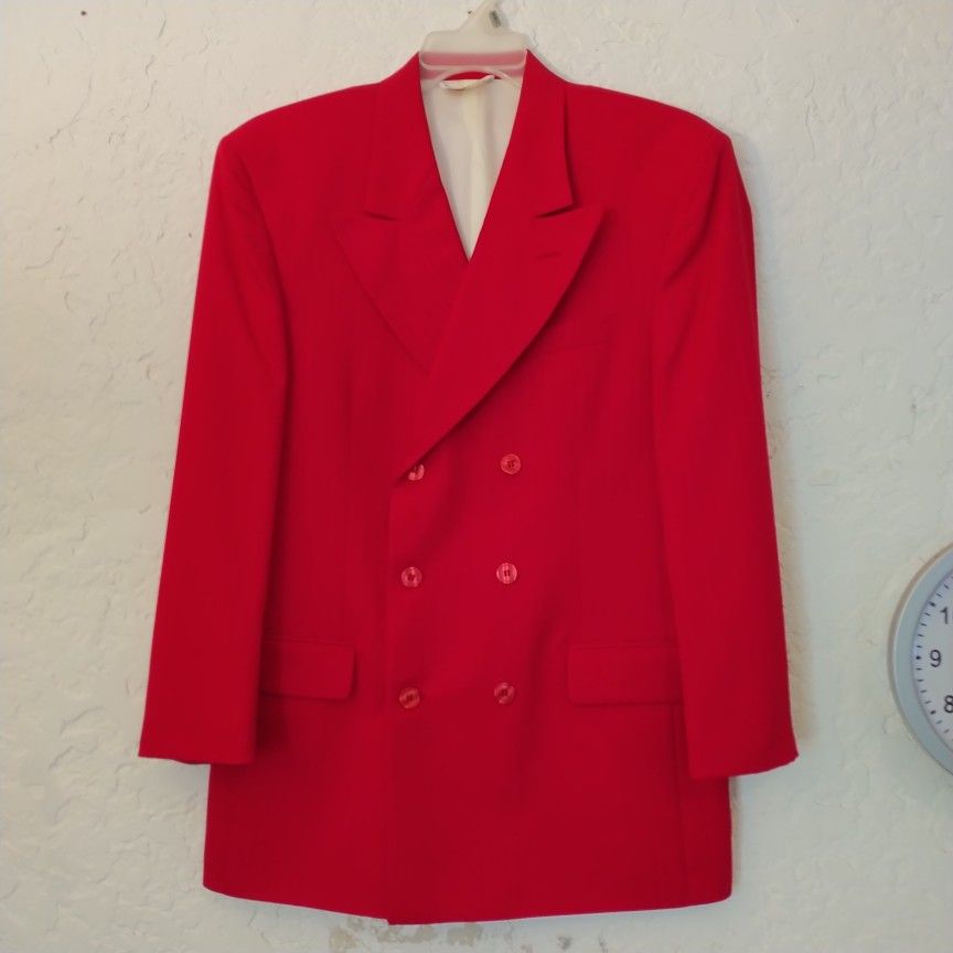 Red Carlo Zarelli Sport Coat. The material has a sheen to it, and it's very lightly striped. Looks good with black or red or white pants. It's an eye catcher. The size is around 42 regular. The coat doesn't say. It's not a wrinkled coat. It resists wrinkles and creases. It holds its shape. Very good material. Quality.. It's a good buy for the price.