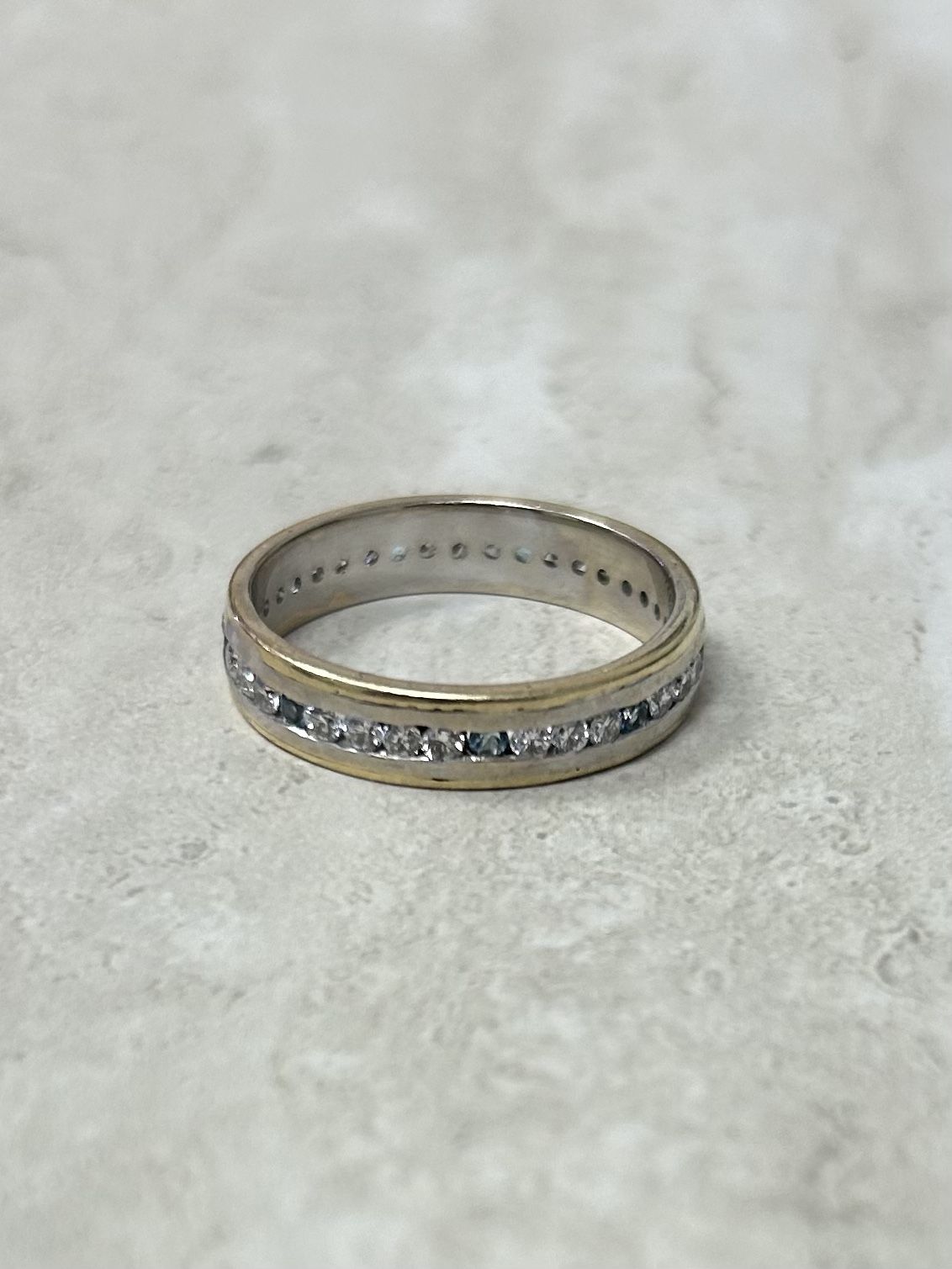 Around a carat of diamonds and some aquamarine stones mixed in. All the stones are natural. The diamonds have a nice color and the blue aquamarines accent them perfectly. This is a beautiful piece of Jewelry. Cannot be sized. Perfect condition. Retails 2200$ my price is negotiable.