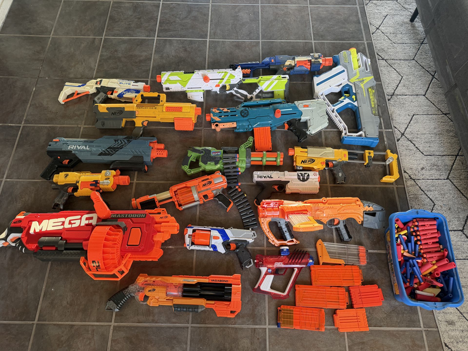 Huge Nerf collection in good condition. Includes multiple styles such as drum fed, magazine fed, Rival ball blasters, Mega dart blasters, and one gel blaster. Perfect for backyard battles, parties, or group play. Included in this bundle: • Total Nerf blasters: 17 • Gel blaster: 1 • Total magazines/clips: 8 • Dart belt: 1 • Large bin of extra foam darts included • Additional Rival balls, gel balls included All blasters are sold as a bundle. LIST OF BLASTERS 1. Nerf Mega Mastodon Style: Motorized 24 dart rotating drum blaster 2. Nerf Rival Kronos XVIII-500 Style: Spring powered Rival pistol 3. Nerf Rival XV-700 Style: Magazine fed Rival blaster 4. Nerf Deploy CS-6 Style: Transforming pump action blaster 5. Nerf N-Strike Elite Retaliator Style: Modular magazine fed rifle 6. Nerf Elite Disruptor Style: 6 dart rotating drum pistol 7. Nerf Elite Strongarm Style: 6 dart rotating drum pistol 8. Nerf Elite 2.0 Shockwave RD-15 Style: 15 dart drum blaster 9. Nerf Elite Rough Cut 2x4 Style: Double barrel pump blaster 10. Nerf Elite Surgefire Style: Rotating drum blaster 11. Nerf Hyper Rush-40 Style: High capacity Hyper round blaster 12. Nerf Rival Takedown XX-800 Style: Pump action Rival blaster 13. Nerf Elite Alpha Trooper Style: Magazine fed pump blaster 14. Nerf Elite Firestrike Style: Single shot compact blaster 15. Nerf Elite AccuStrike FalconFire Style: Single shot precision pistol 16. Nerf Elite Rampage Style: Drum fed rifle blaster 17. Dart Zone Blitzfire Style: Revolver style dart blaster 18. Gel Blaster Surge Style: Automatic gel bead blaster KEYWORDS Nerf bundle Nerf blasters toy blasters Mega Nerf Rival blaster foam darts gel blaster magazine fed drum blaster kids outdoor toys backyard battle set large Nerf collection extra ammo included