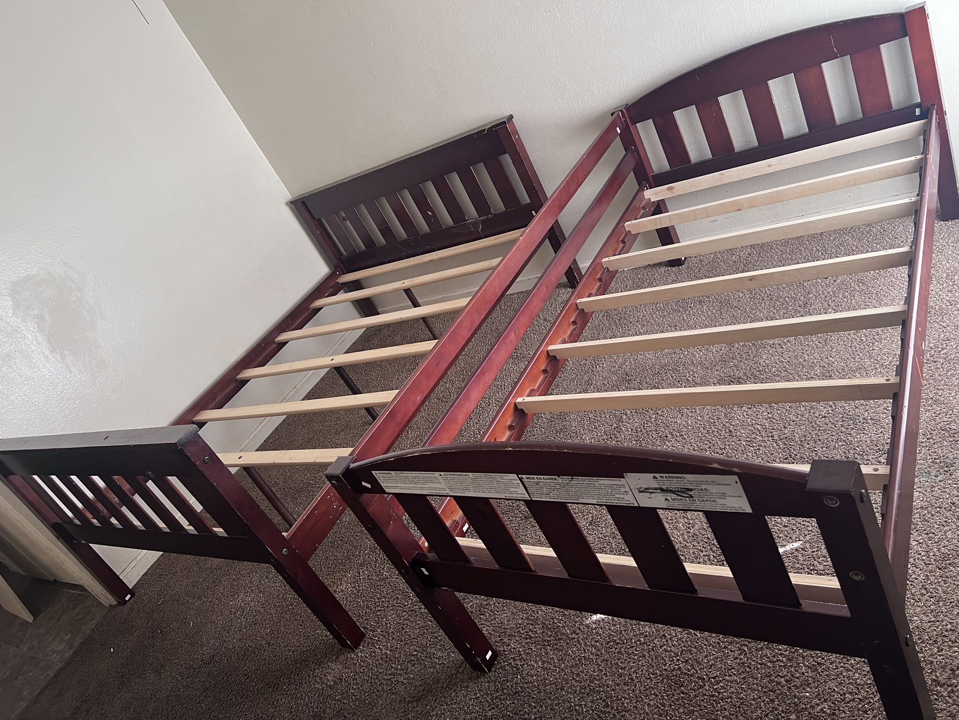 - $100 o.b.o. - Cherry Wood Bunk Beds - Bunk beds are stackable or able to be used as 2 beds. - Pick Up Only