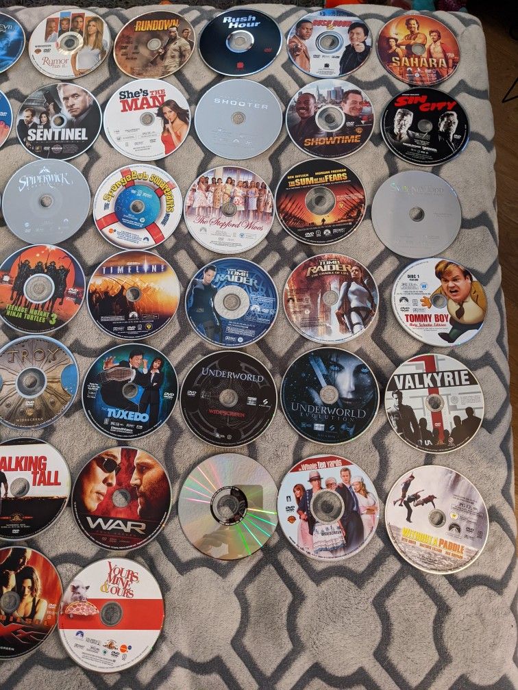 140+ movies left for sale on DVD. No scratches, all discs are functional. Selling 50¢ each or $65 for all (45¢ each) -Sold Titles- After the Sunset Back to the Future Part I Back to the Future Part II The Bourne Identity The Bourne Supremacy Gran Torino Indiana Jones and the Temple of Doom Indiana Jones and the Raiders of the Lost Ark Over the Hedge Oh Brother, Where Art Thou? Ocean 12 Pink Panther The Rundown The Transporter The Transporter 2 The Transporter 3 Tuxedo War