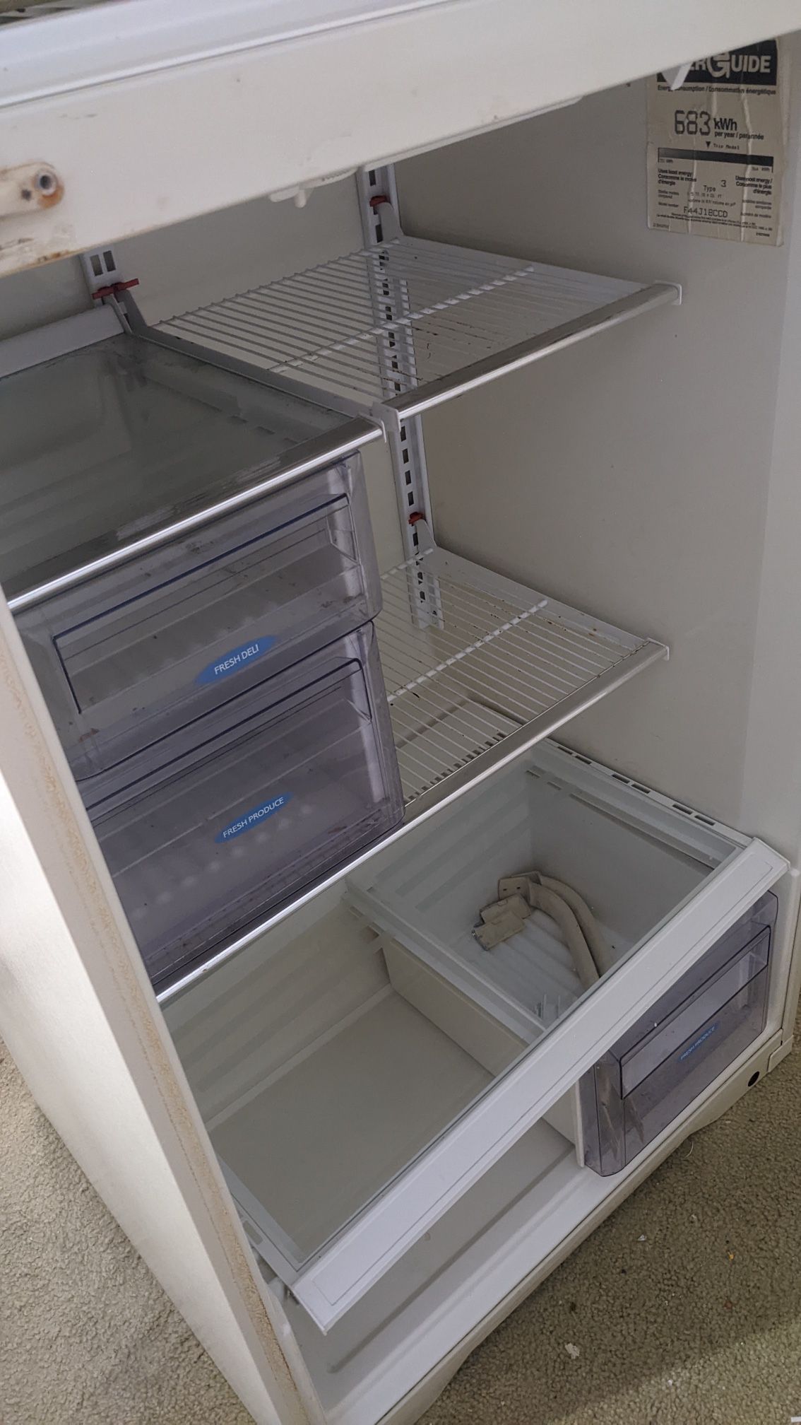Beige, regular size fridge for a garage or a rental unit or just as an extra fridge works well