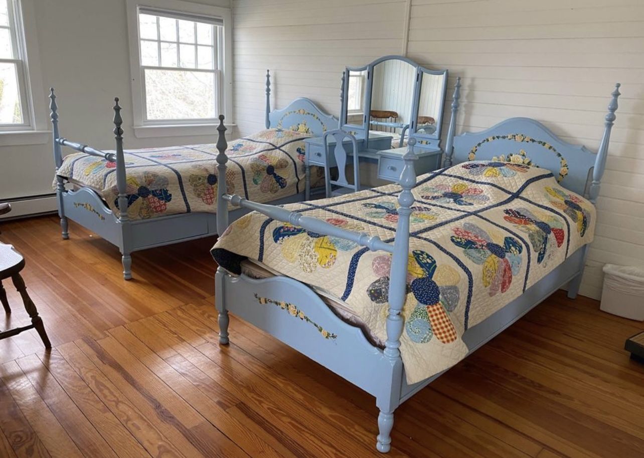 This is pair of two matching single / twin size bed frames. Painted Light blue with yellow artistically painted yellow flowers. They have a shabby chic country traditional cottage style. Perfect for a girls room, children’s bedroom, guest bedroom, or summer rental property. In very good condition with minimal wear. The headboard posts are 52 1/2 inches tall. The footboard posts are 44 1/2 inches tall. The middle of the Headboards are 43 1/2 inches tall. The middle of the footboard blanket rails are 31 inches tall. And headboard and footboard are both 42 inches wide. The pair is Priced for $400 dollars. Will not separate. Also selling a matching matching desk / dressing table vanity for $250 separately. See last picture. If interested message or call Sarah six, one, seven, five, one, nine, three, three, five, six. Easy Garage Pickup in Wareham. Can deliver for an extra fee.
