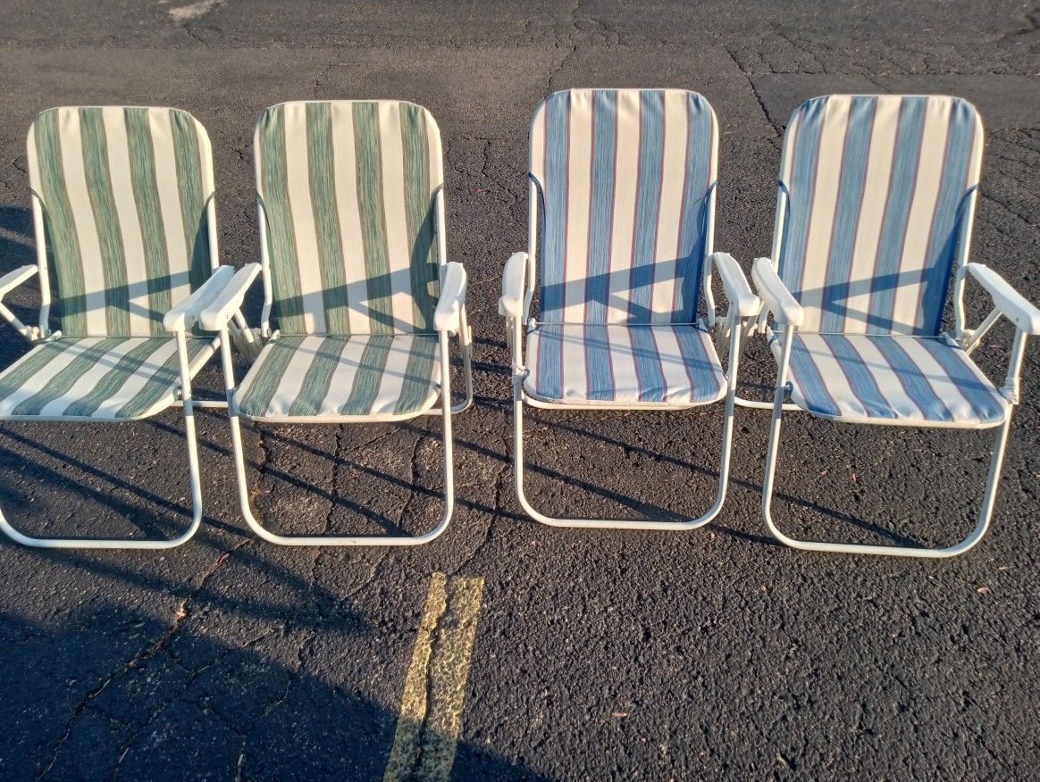 i have a set of 4 nice(people) i mean really,really nice lawn or garden/ folding beach chairs it's metal or aluminum with vinyl and in good condition for being used.Well i have these newer set of 4 metal white/blue green2 different color chairs with upgraded bungy support cushion overall for being used not bad at all i say its in excellent,excellent condition i believe these new for just one will cost about 59.00 without tax so that will be around 250.00 for all 4 and or if you bought them new well im asking half of that 125.00 OTD for gently used i say its a very good deal SAVE $$$ SAVE $$$ and you dont have to pay retail either please text me at (contact info removed) thanks god bless america..I sell at warehouse one antiques on century st we can meet there or at any gas station thanks thanks