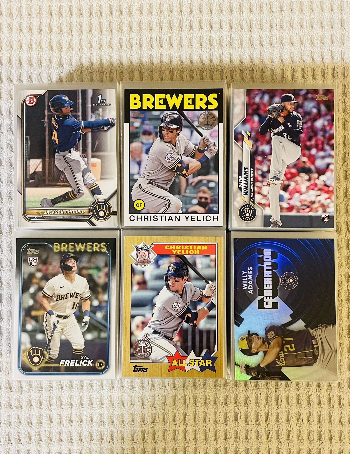 Milwaukee Brewers 365 Sports Card MLB Baseball Card Team Lot! All cards in mint condition! Rookies, prospects, All-Stars, HOFers, inserts, parallels, refractors, short prints, exclusives, variations & more! Mix of Bowman, Bowman Chrome, Series 1, Series 2, Update Series, Opening Day, Topps Chrome, Stadium Club, Stadium Club Chrome, Heritage, Diamond Kings, Donruss, Donruss Optic, Select, Upper Deck & more! Christian Yelich, Jackson Chourio, William Contreras, Garrett Mitchell, Sal Frelick, Andruw Monasterio, Tyler Black, Oliver Dunn, Freddy Peralta, Brandon Woodruff, Tobias Myers, Devin Williams, Aaron Ashby, Eric Brown Jr, Luis Lara, Daniel Guilarte, Felix Valerio, Jheremy Vargas, Ryan Braun, Robin Yount, Jim Gantner, Dave Nilsson, Mark Loretta, Jeff Cirillo, Dan Plesac, Greg Vaughn, Fernando Vina, Darryl Hamilton, Jose Valentin, Mike Fetters, Kevin Seitzer, Cal Eldred, Pat Listach, John Jaha, Jeromy Burnitz, Chris Bosio & much more! $50 for the lot! Local pick up & shipping available. Message for details. Thank you!