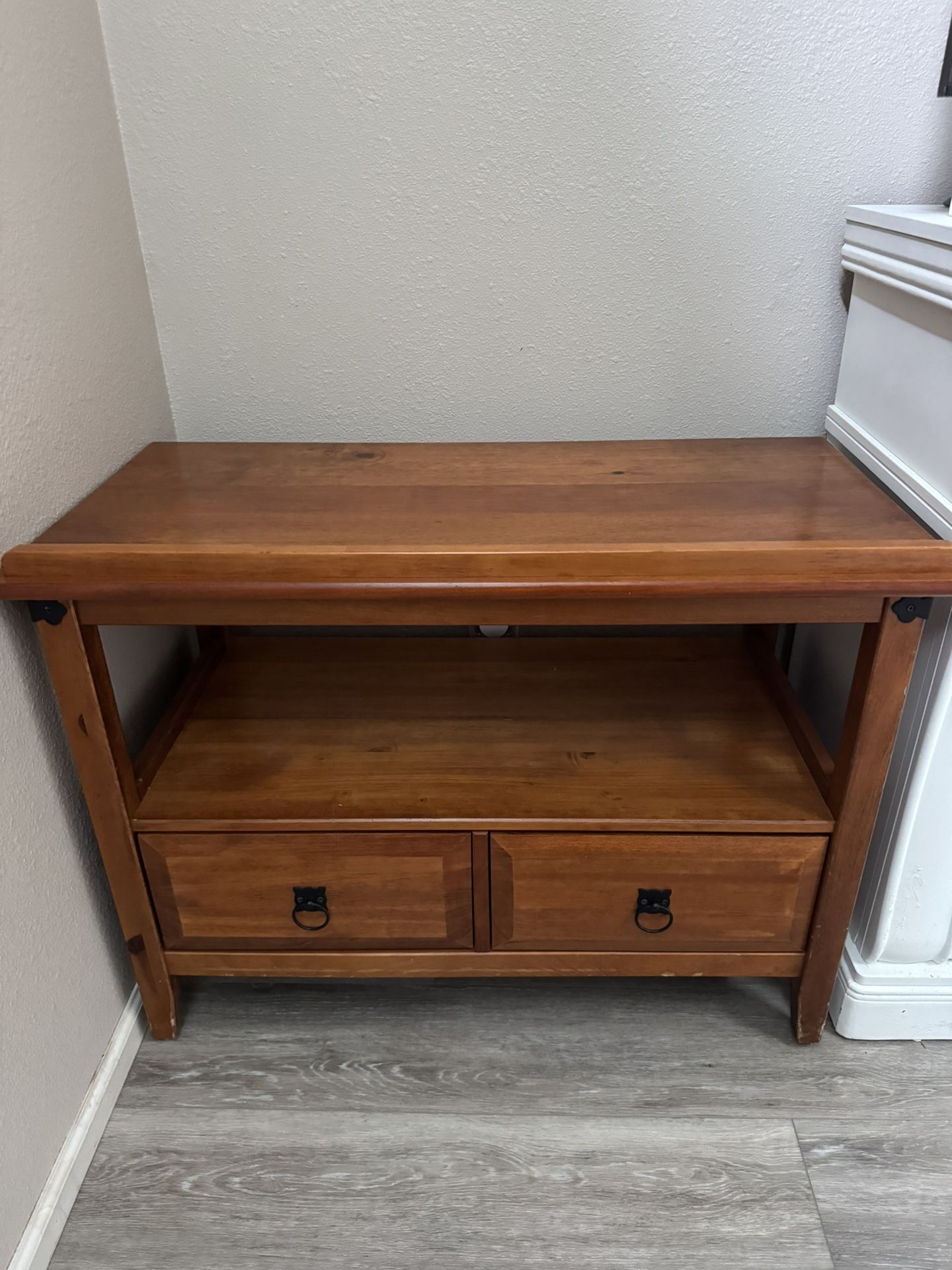 Tv stand , coffee table, 2 end tables I was goin to paint the set white. I hate my life for not having time!! I have other priorities. Set has minor damages, lots of storage! Wood is pretty solid, but not too heavy either. Beautiful set.