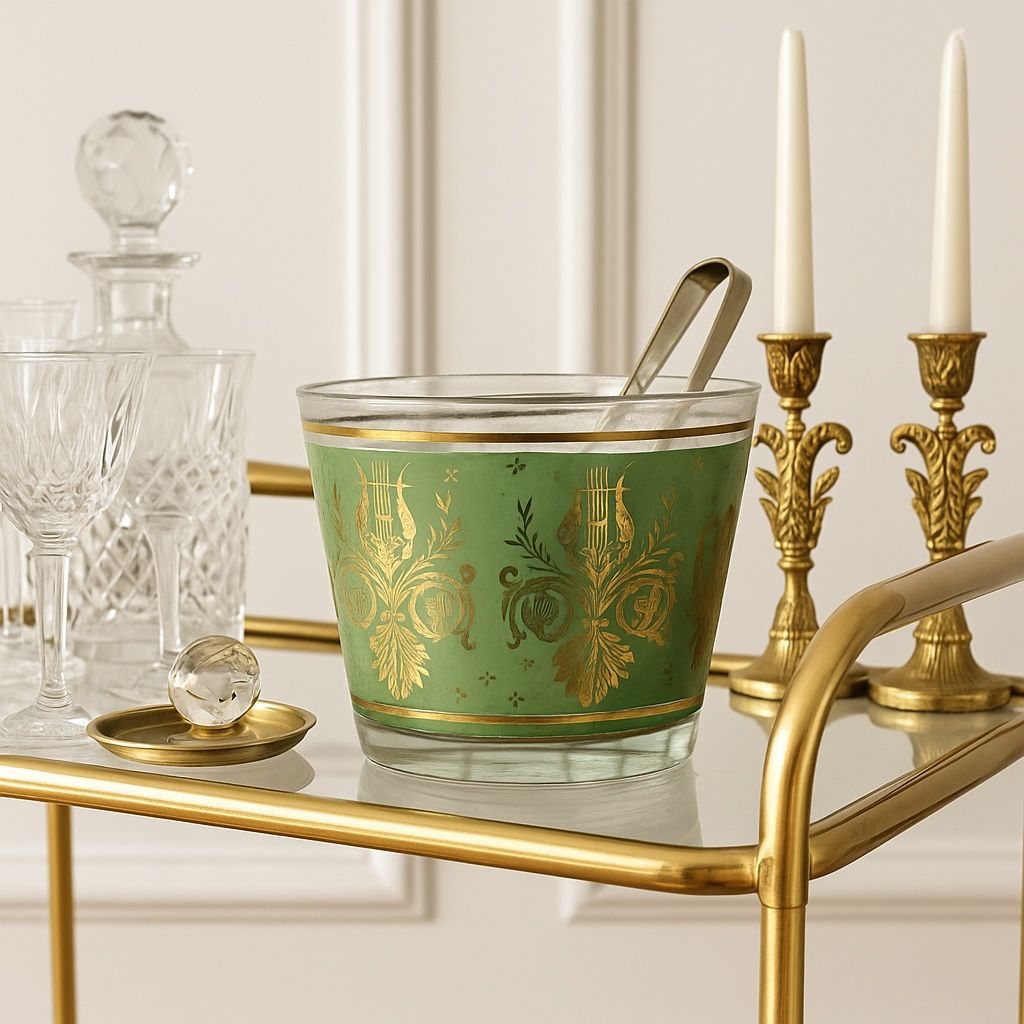 Jeannette Glass USA 1960s Laurel & Lyre Green Ice Bucket, 6x5” SHIPPING IS INCLUDED PLEASE NOTE: The first image is an artistic representation; all other photos and the video show the actual item. Pictures are part of the description, please check them & let me know if you require additional ones. Great vintage condition consistent with age — glossy, beautifully detailed, and displays wonderfully. Defects & imperfections – please check pictures made under the bright light & magnification: • Cloudy residue along the inner rim • Light surface scuff on the green enamel in one spot, practically unnoticeable in real life. • Light scuffs on the base Dimensions: 6 x 5 in Weight: 2 lb 3 oz Love more than one item from my store? Feel free to message me—I’m always happy to combine shipping or create a custom bundle just for you.