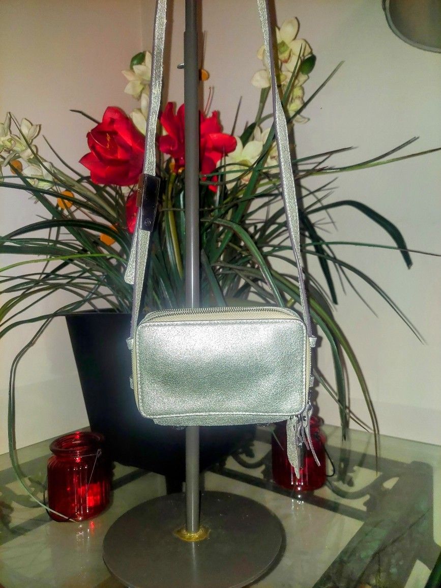 Cute Silver Crossbody Bag With Adjustable Strap in good pre-owned condition. I'm not sure what brand it is. Lots of pockets for organization. Strap drop is 15" at its shortest and 23" at its longest.