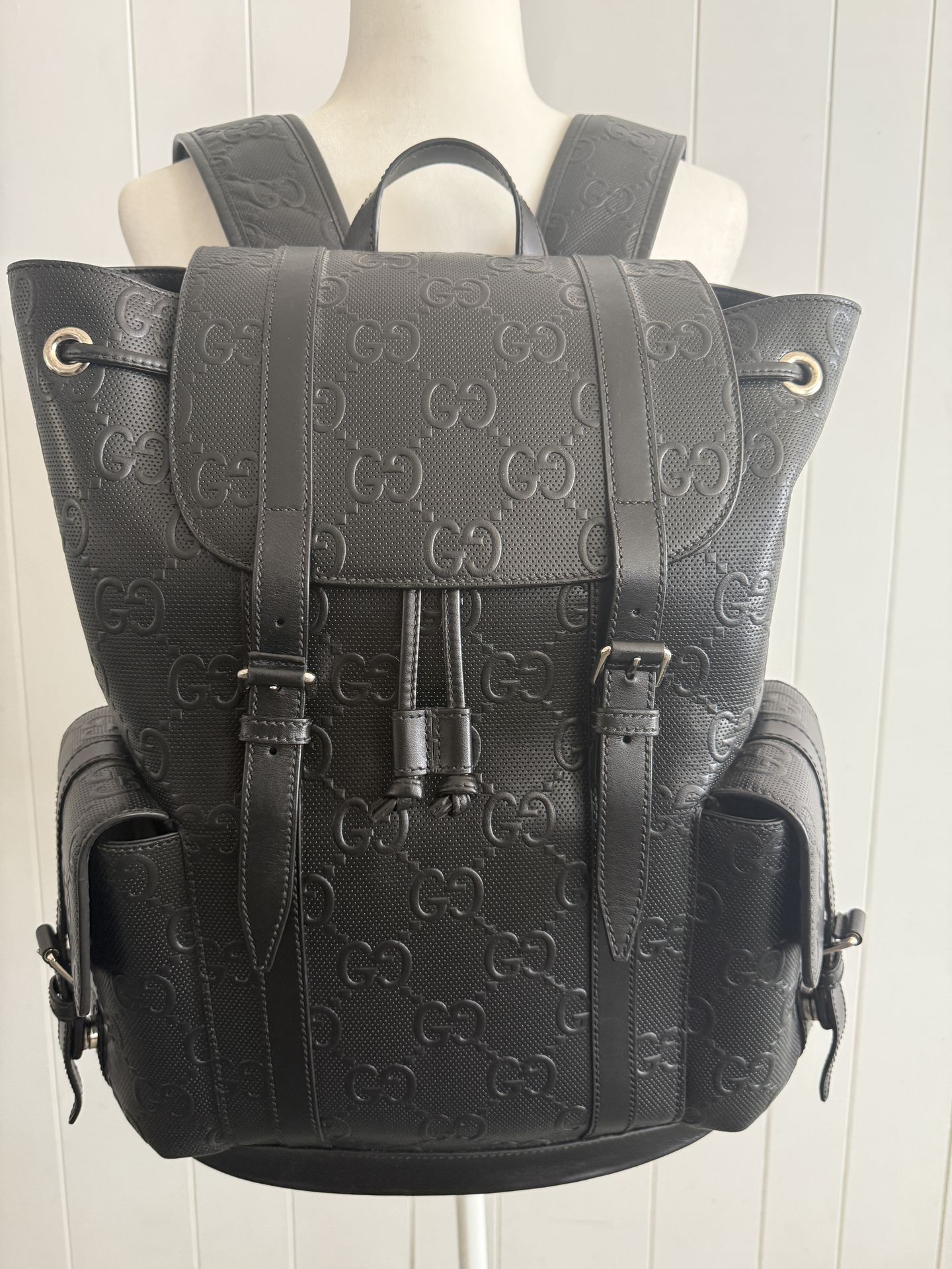 Authentic Gucci GG Embossed Leather Backpack in black. Excellent used condition – leather is clean, structured, and well maintained. No major flaws. Features: • Signature embossed GG leather • Dual front buckle straps • Drawstring closure • Two side utility pockets • Adjustable shoulder straps • Spacious interior Retail was over $5,000. Selling for $2,500 OBO. Serious buyers only. Can meet locally or ship.