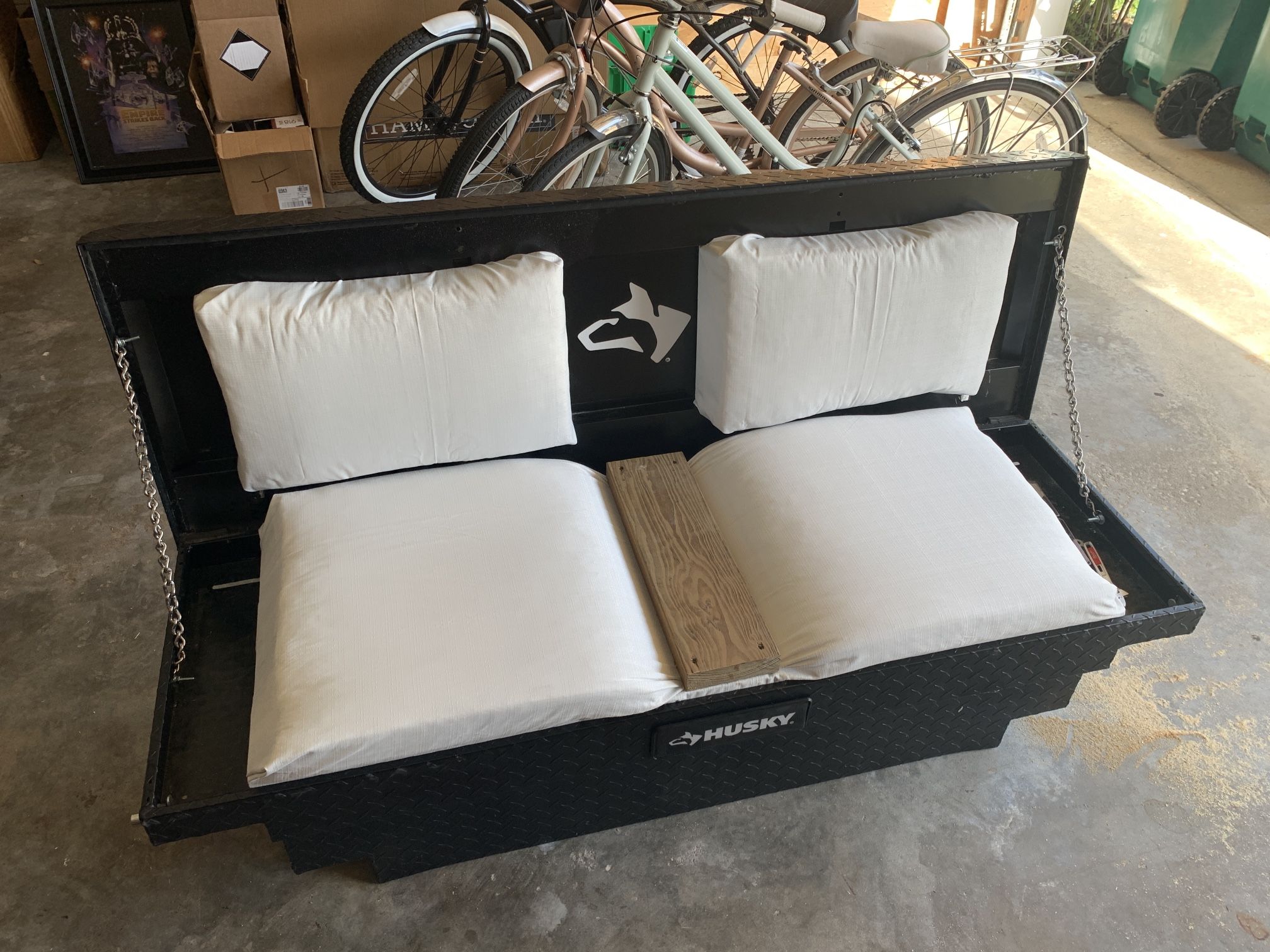 Custom Husky truck bed toolbox bench.