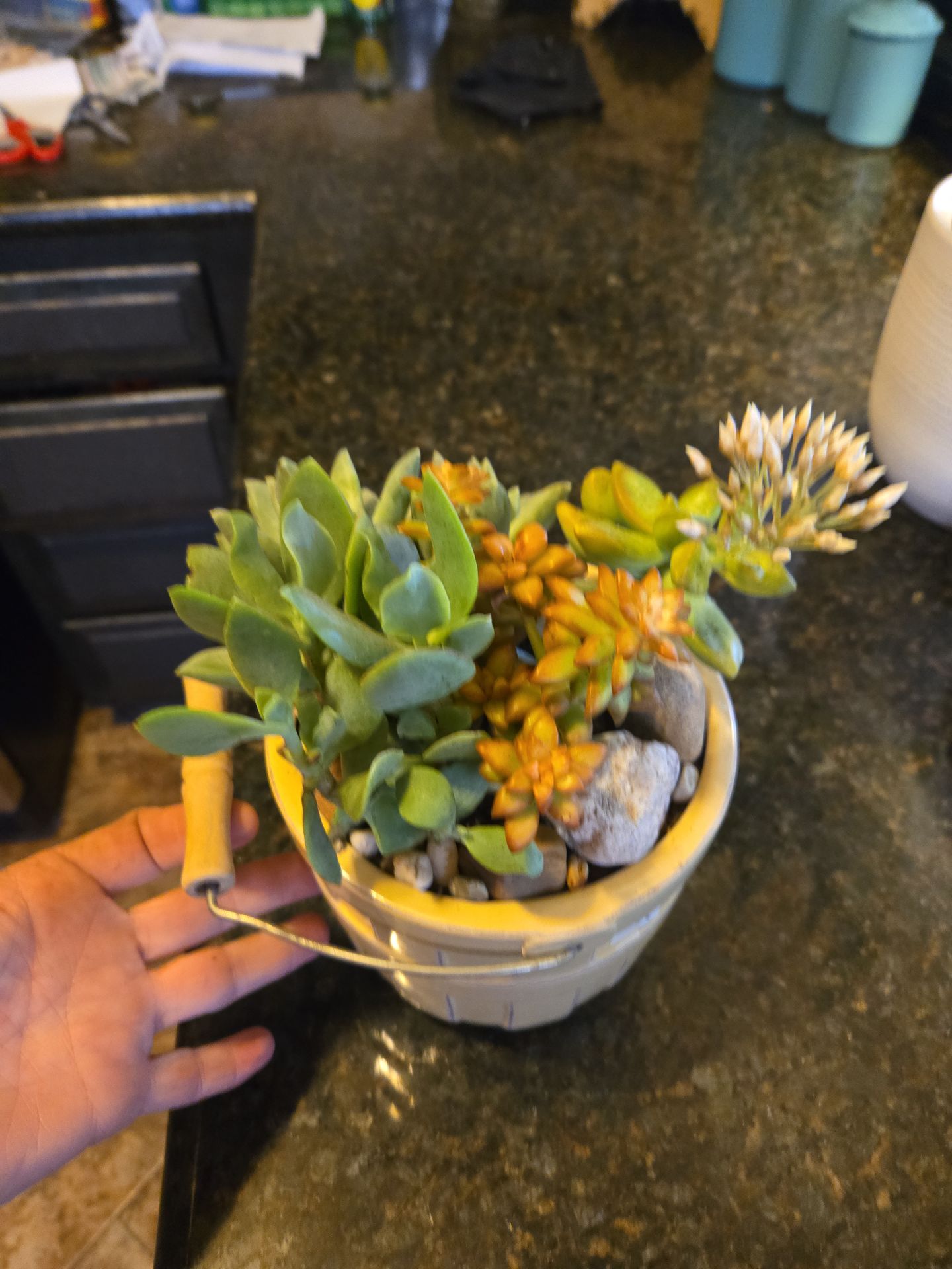 13in tall jade plant in heavy nice 6in ceramic pot with shells and stones