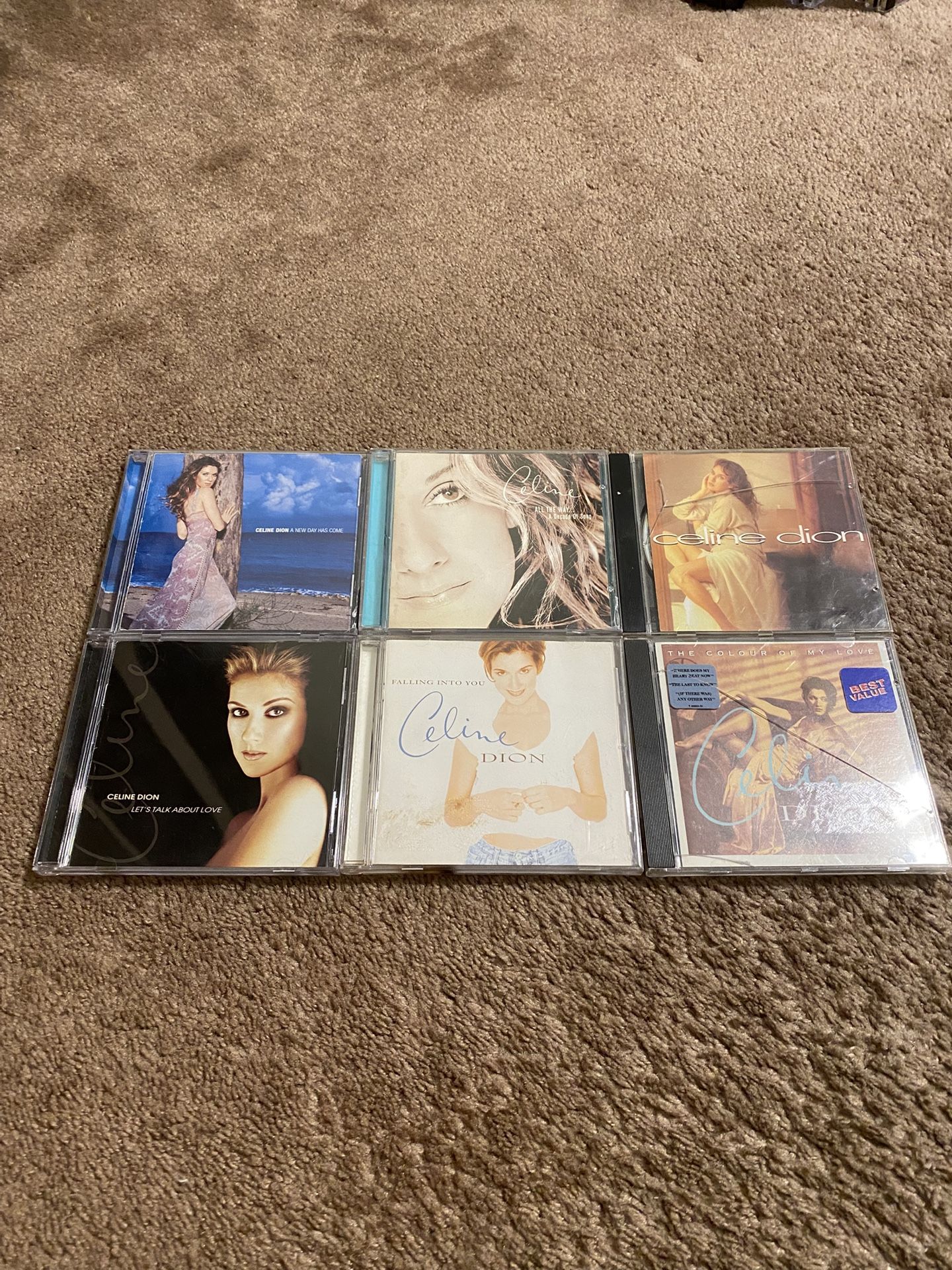 $1 each. Or $3 for all 6. Celine Dion - A New Day has Come - case front cover has some chips on lower edge Celine Dion - All The Way . . . A Decade of Song - case front cover has a small crack Celine Dion - Celine Dion - case cover has cracks Celine Dion - Falling Into You Celine Dion - Let's Talk About Love - case has broken hinge - back of case has a crack Celine Dion - The Colour Of My Love - case front cover has cracks