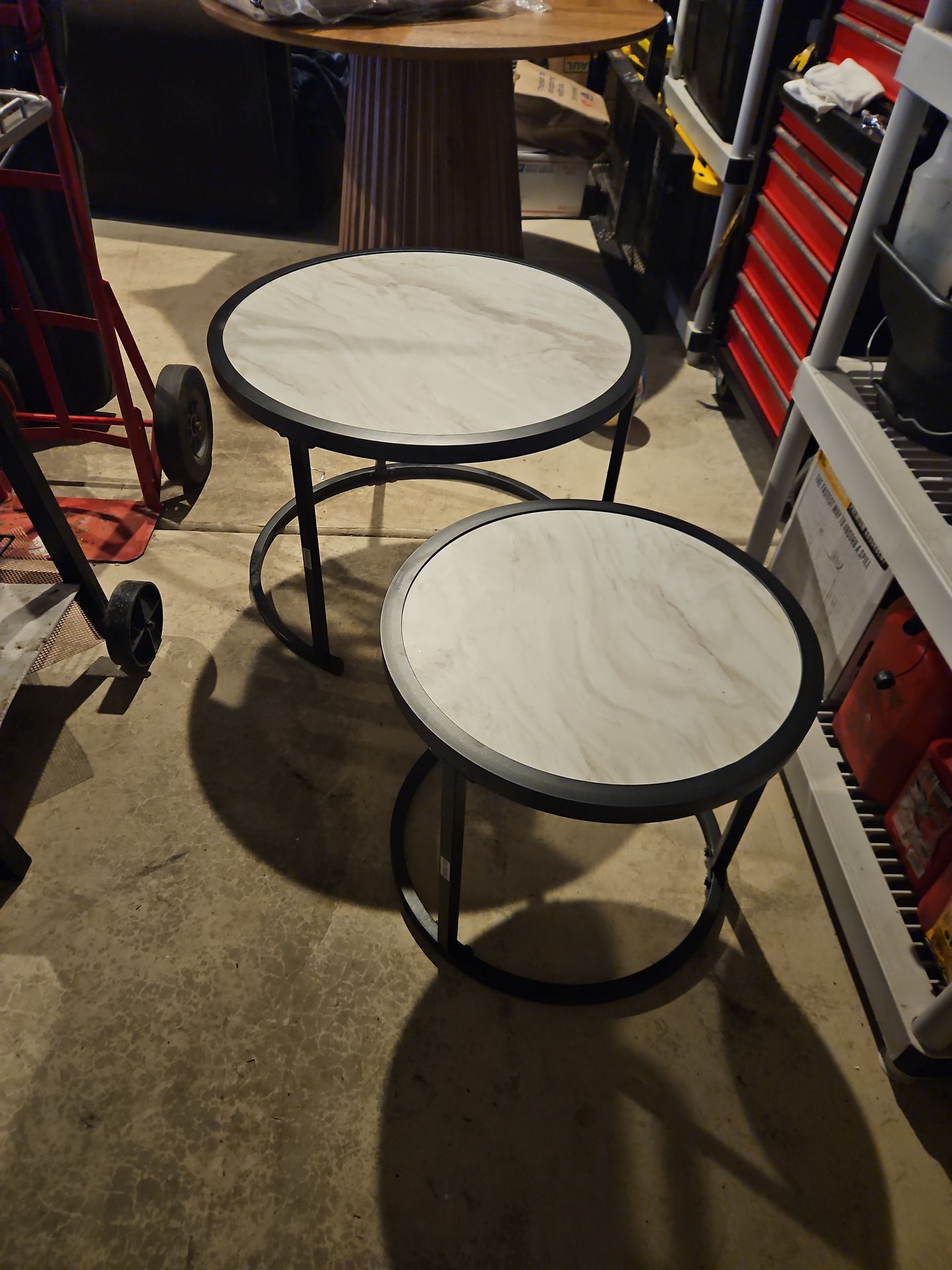 Brand new ceramic topped metal framed nesting tables. Big table- 20" tall by 28" wide Nesting table- 18" tall by 20" wide Good quality heavy tables