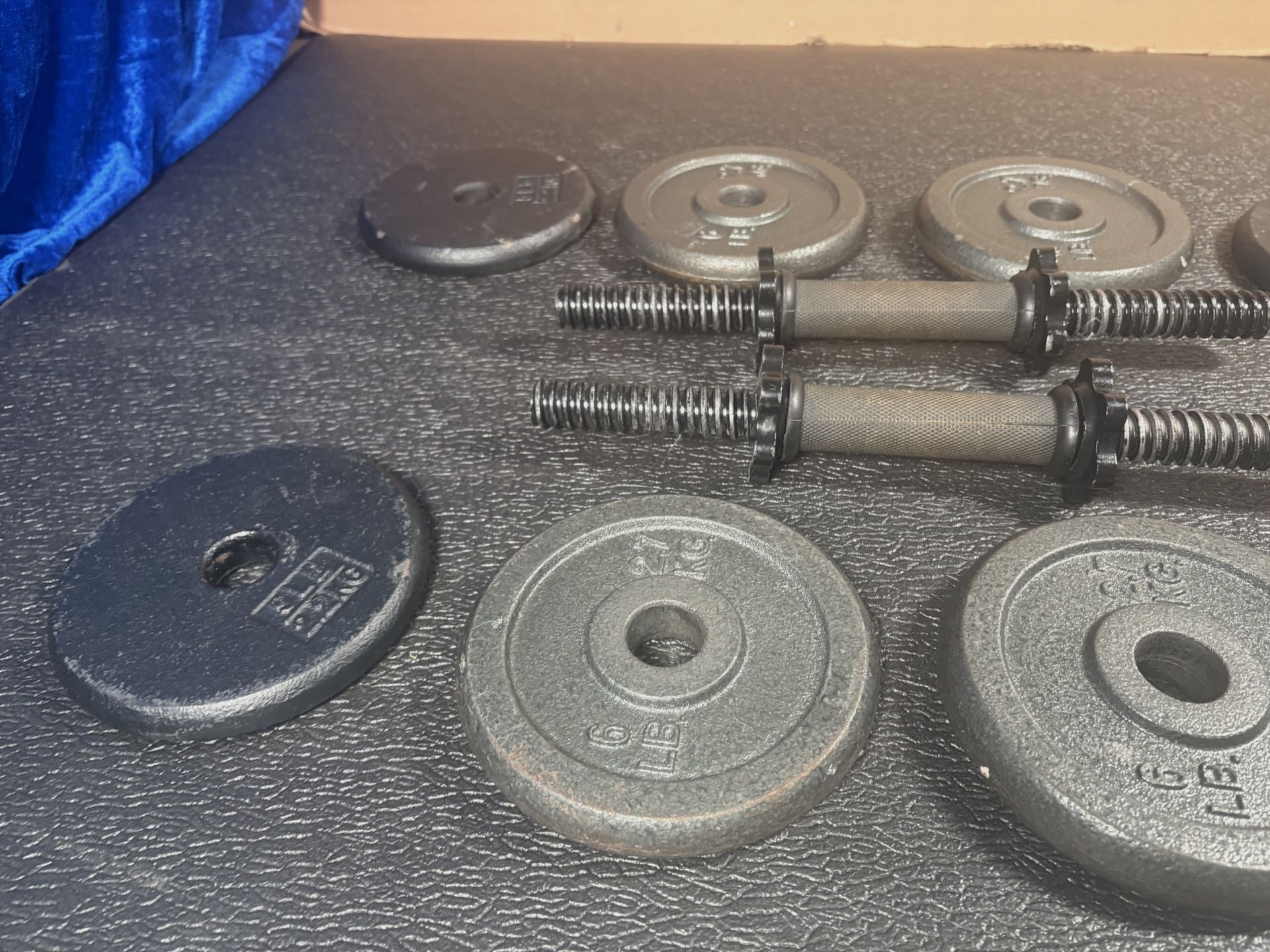 Set of Cast Iron Dumbbells. 54 # [NO LOWER PRICE] Gently Used. What you get: 4X6 # and 4X5 # weight plates. One pair of dumbbell bars(5 # each). Brute Weight = 54 lbs