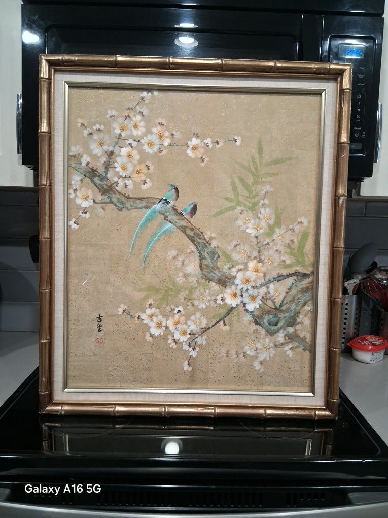 28 inchs long,231\2 wide no damage SMOKE FREE HOME. Hand painted asian style painting. Too long tale birds on a blossoming cherry or plum tree branch.