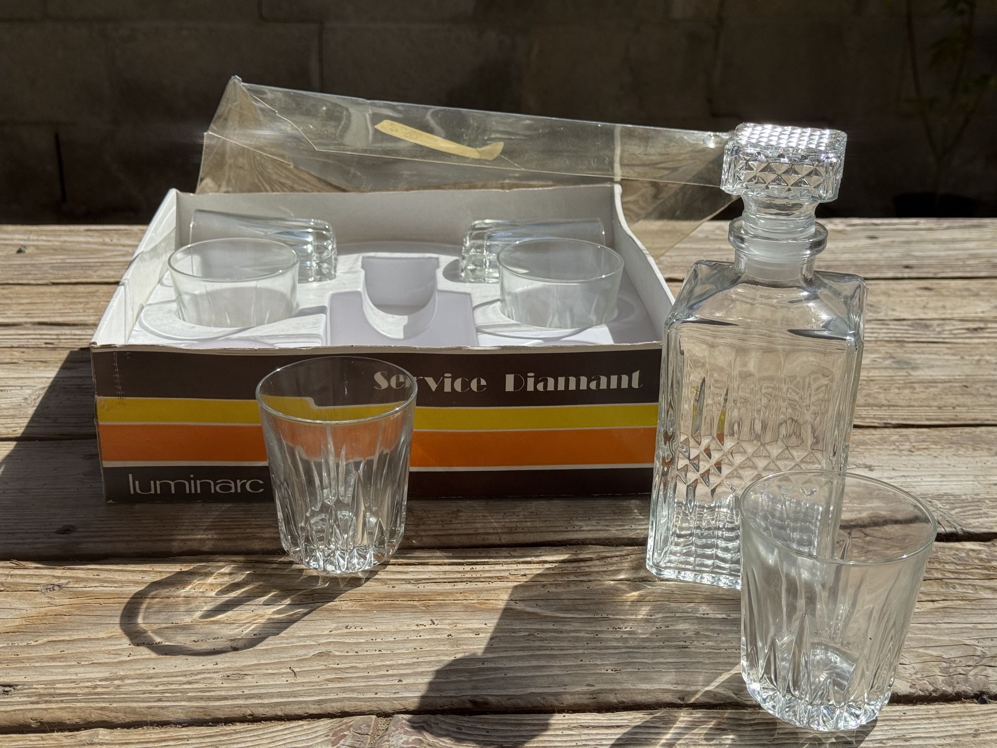 Vintage French decanter and glass set. It is set of 6 glasses with a retro feel.