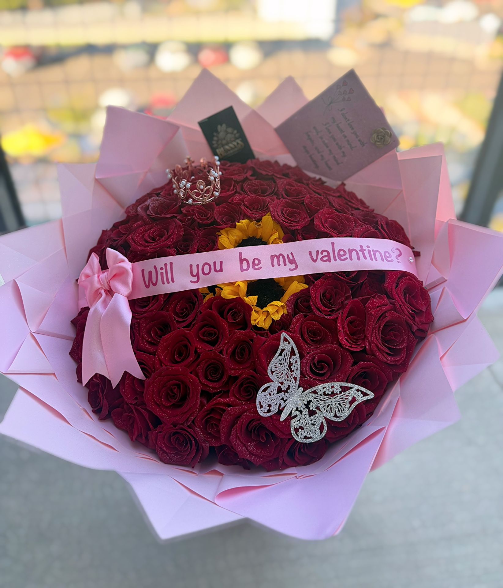 Beautiful handmade bouquet with red roses and a sunflower heart in the center. Wrapped in pink paper with cute details: a crown, butterfly, bow, and a ribbon that says “Will you be my Valentine?” Perfect for Valentine’s Day or to surprise someone special 💖 Local pickup available. Limited availability — message me if interested!