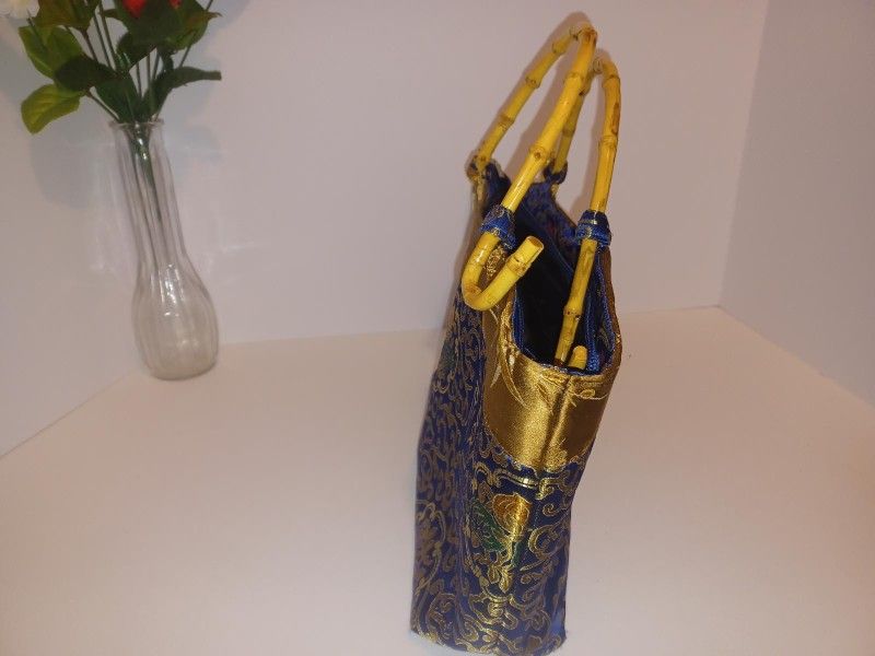 Beautiful Oriental design purse outside is silk material, the handles are bamboo and it is a unique purse in good condition