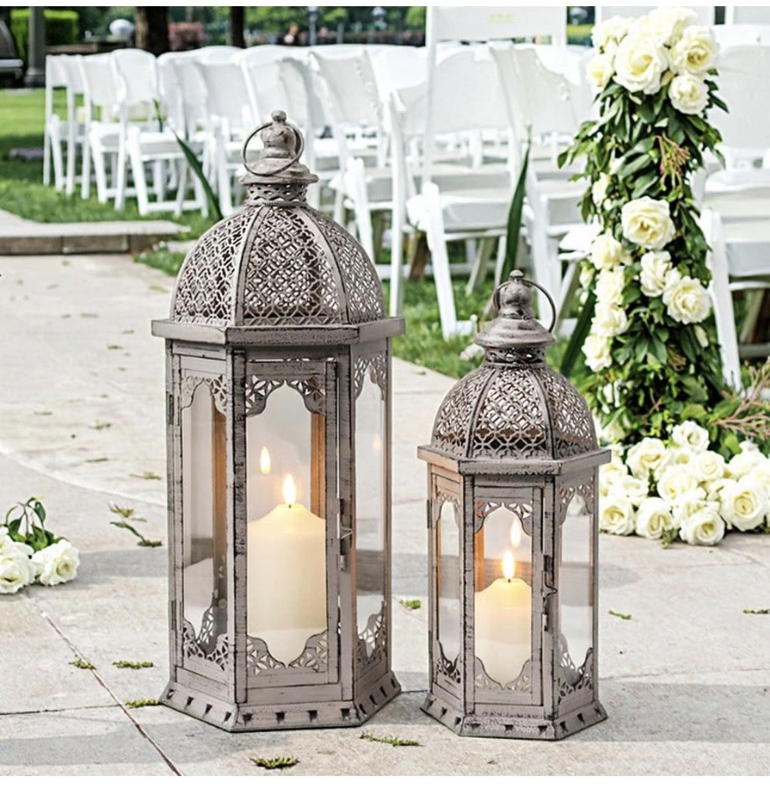 Set of 2 Decorative Candle Lanterns 22"&17" H Vintage Metal Candle Holder for Garden Indoor Outdoor Parties Weddings Patio Home Decor(Grey with Black Brush)