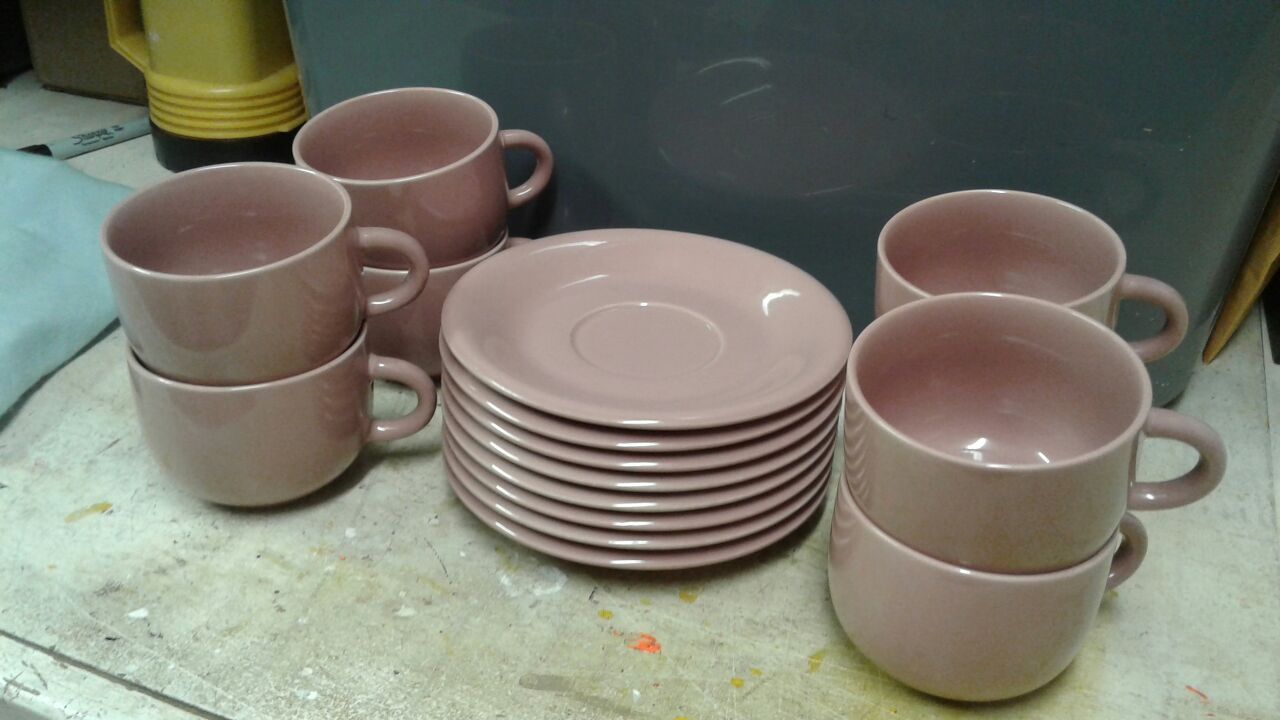 Nice coffee and soucer set 8 total no issues all in great shape for kitchen or dining use No damage samon or dark pink color nice dishes