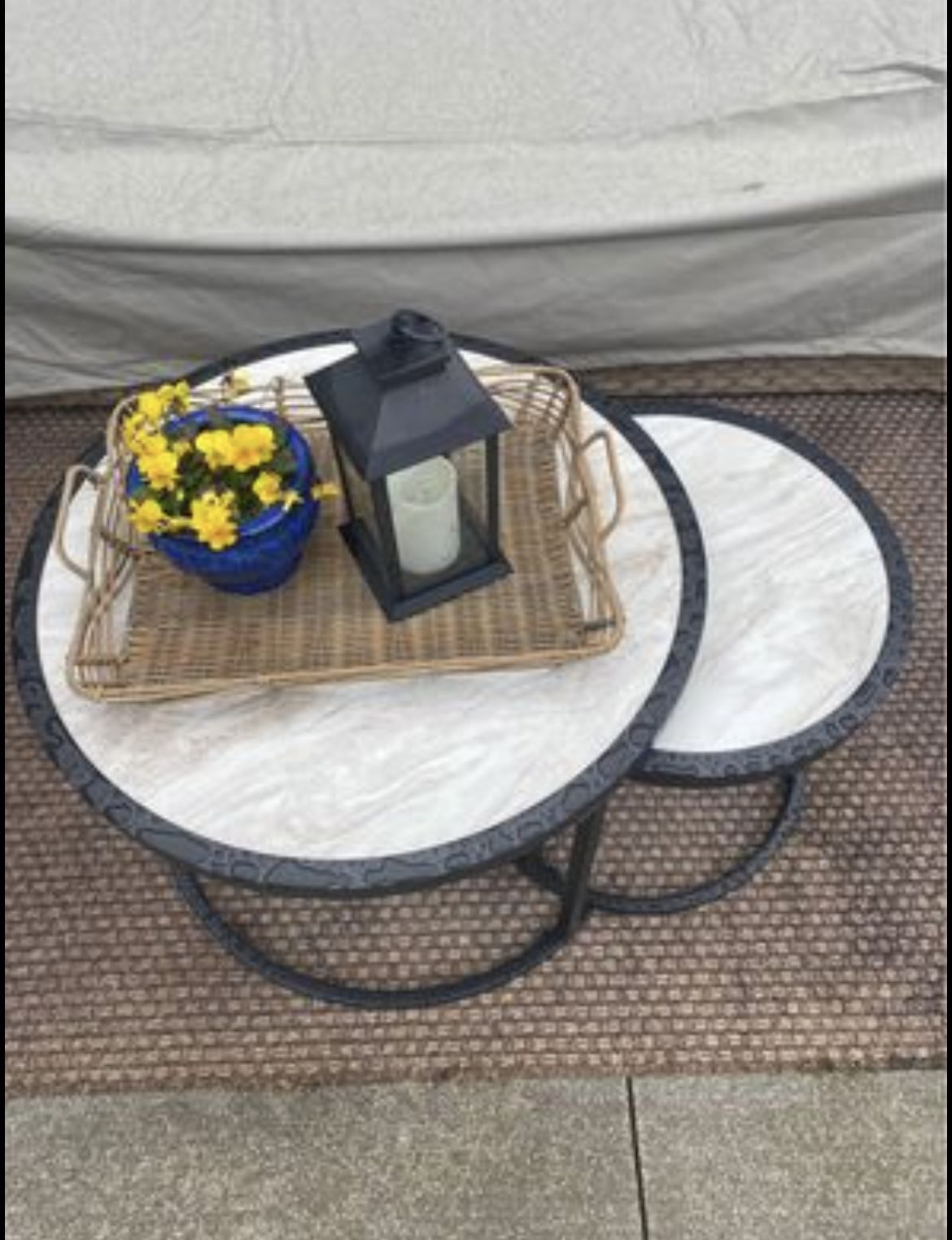 These nesting tables are brand new, just built. They came included in my furniture set but their round shape doesn’t fit our space. The tops are a faux marble tile. Measurements: Large table~ 20.8”H x 27.95”D Small table~ 18.11”H x 29.08”D Asking $140 or OBO for the set