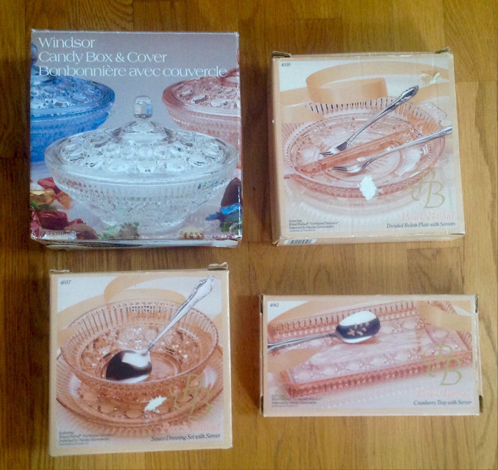 All this 4 items r imported by Oneida Silversmiths if u want all 4 only $20 Brand new peach candy bowl with lid $6 Brand new Sauce / Dressing set with server ( peach Ballard ) $6 Brand new divided Relish plat with server ( 2 fork ) ( peach Ballard ) $5 Brand new cranberry tray with server ( stainless still spoon ) ( perch Ballard )