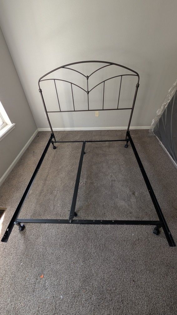 This is a complete **Queen Size** metal bed frame and headboard set, ready for use! It features a classic arched, decorative metal headboardwith a dark bronze This elegant design works well with traditional or transitional bedroom decor. The set includes: Decorative Metal Headboard: Features an ornate, scrolled design. Heavy-Duty Queen Frame:A sturdy, adjustable metal frame with side rails and a center support beam. Wheels/Glides: The frame includes wheels/casters for easy movement Details: Note: This listing is for the . Headboard and Frame ONLY. Mattress, box spring, and bedding are *not* included. Local pickup only in the Bartram Park Jacksonville, Florida. Please message with any questions! Size: Queen Material: Metal / Wrought Iron Look Color: Dark Bronze Condition: Excellent used condition Fully assembled for easy inspection.] Assembly:** Currently set up for easy viewing, but easily disassembles for transport.