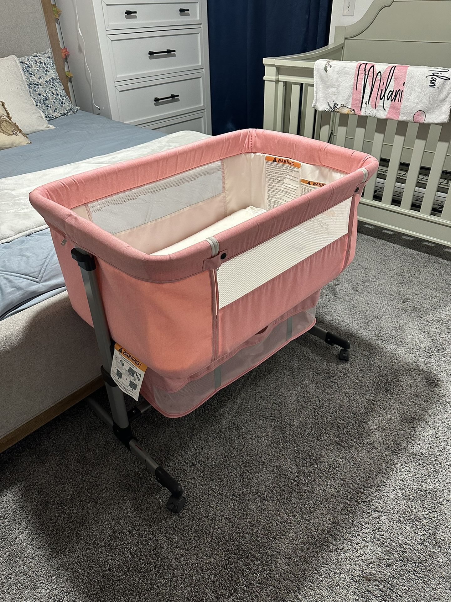 Pink Bassinet, only used 3 months. It’s like new, I would always use blankets and covers to lay baby. It comes with bag and easy to build.