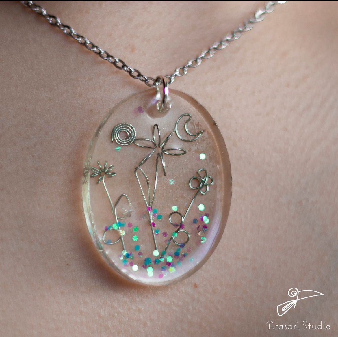Handmade necklace with wire little flowers, moon and spirals in resin. Made in Ecuador (artisanal process). Made by ArasariStudio