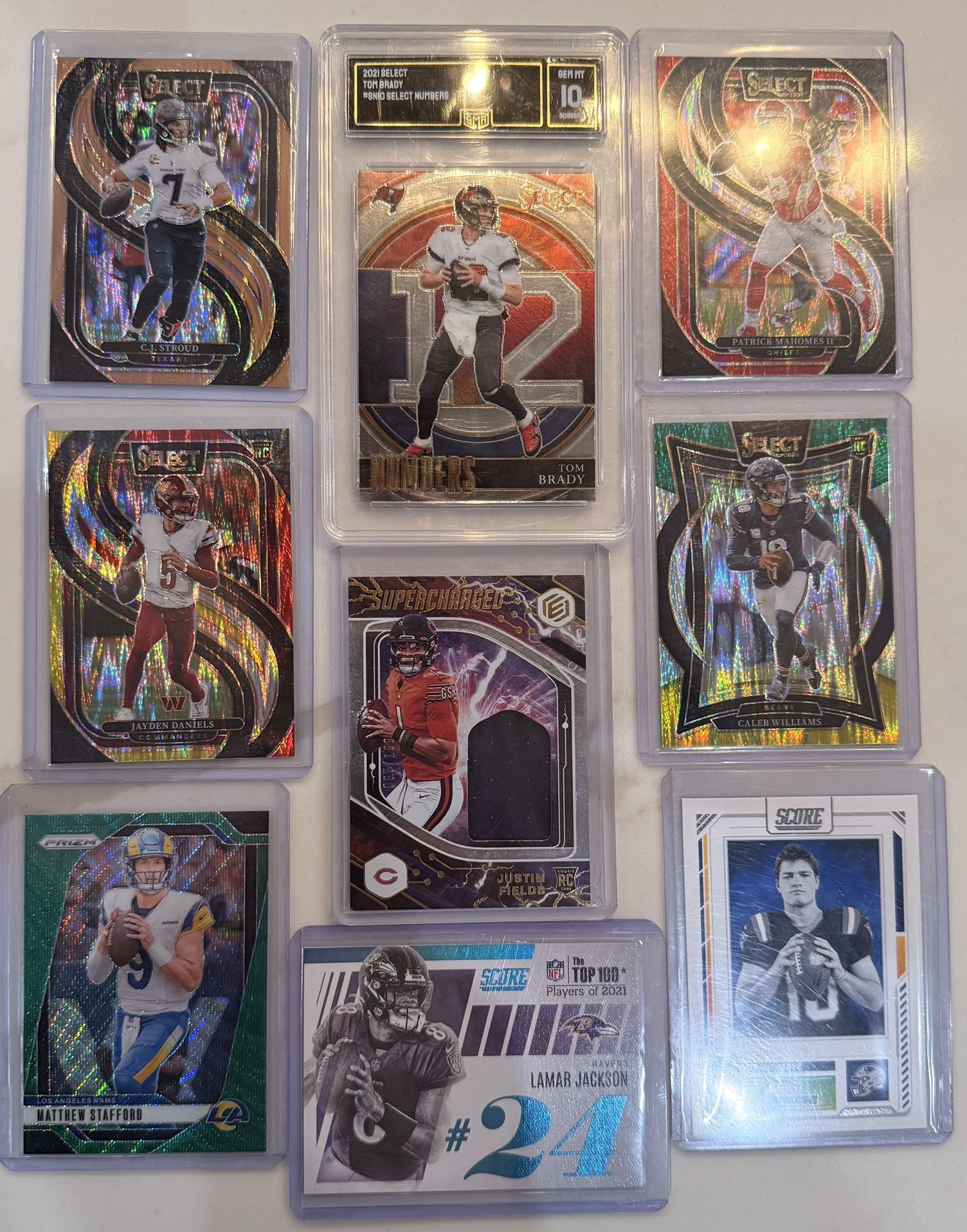 This Football Card Lot includes 9 cards featuring top quarterback players such as Tom Brady graded 10, Patrick Mahomes, and Lamar Jackson. The cards are from the 2020 Panini Mosaic set and are made of standard card stock material. Each card is labeled or stamped with an autograph from players like Justin Fields and Drake Maye. This lot is perfect for football fans looking to add some high-quality cards to their collection, especially with the inclusion of rookie and insert cards. CJ stroud RC /299 Rare hit Lamar Jackson Justin Fields relic RC card /199 All insert cards!!!!!! Only the best.