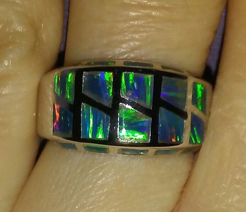 Up for sale is this lovely new and just in time for Valentine's Day π stunning stamped 925 solid sterling silver band style ring with green, blue and red very vibrant colors of fire Opal inlay set into the band. This ring is absolutely stunning and is a SIZE 5! From our smoke-free home.