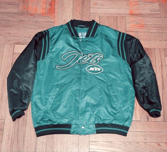 This is an Ultra Game brand New York Jets bomber jacket. It's a size medium with a quilted lining. The jacket's body is teal with black sleeves and striped ribbing at the cuffs, collar, and hem. Great for showing team spirit!