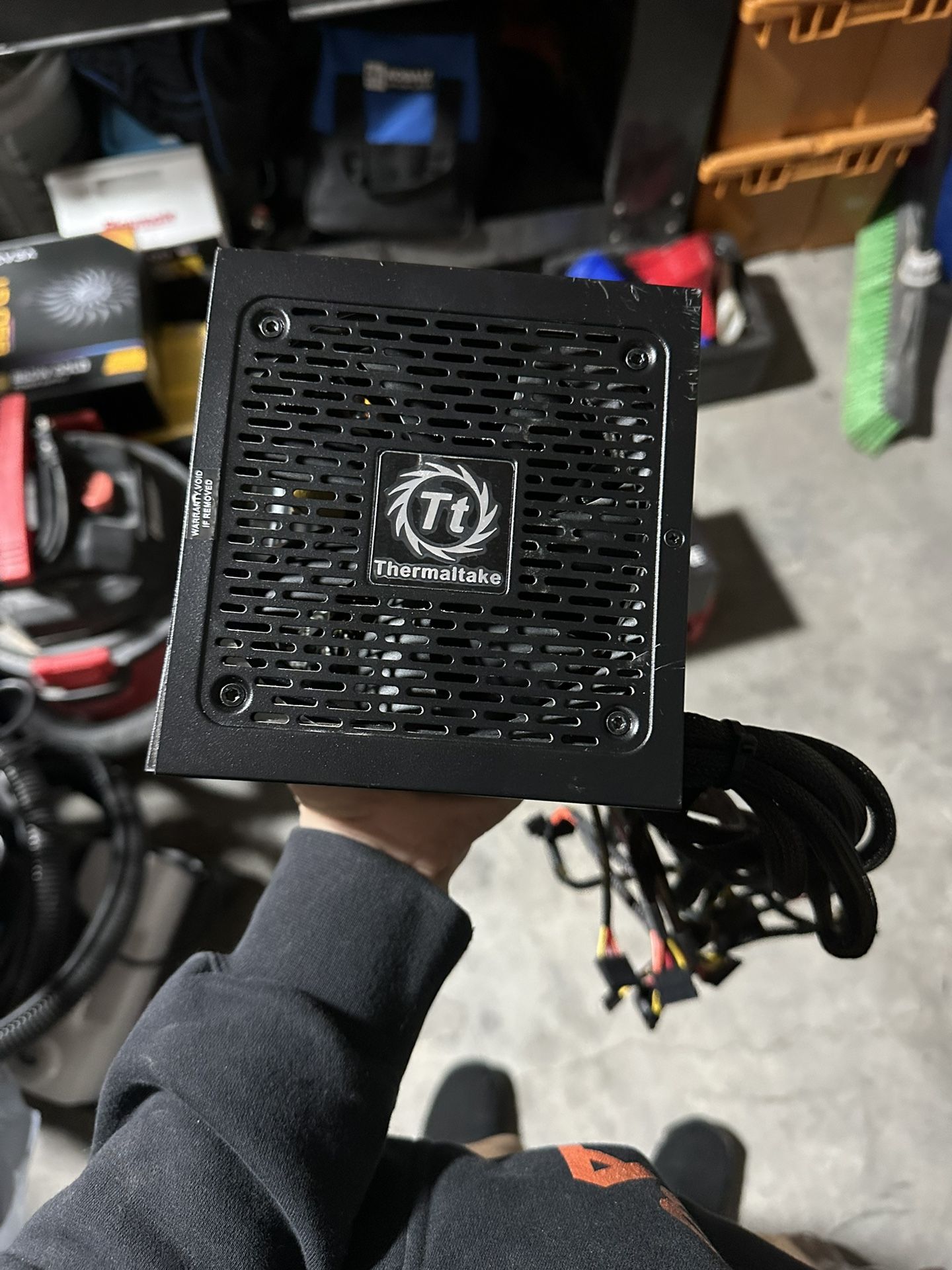 600w power supply it’s a thermal take works perfectly I just upgraded to a higher wattage Came with my prebuilt that I’ve only have for 2 months
