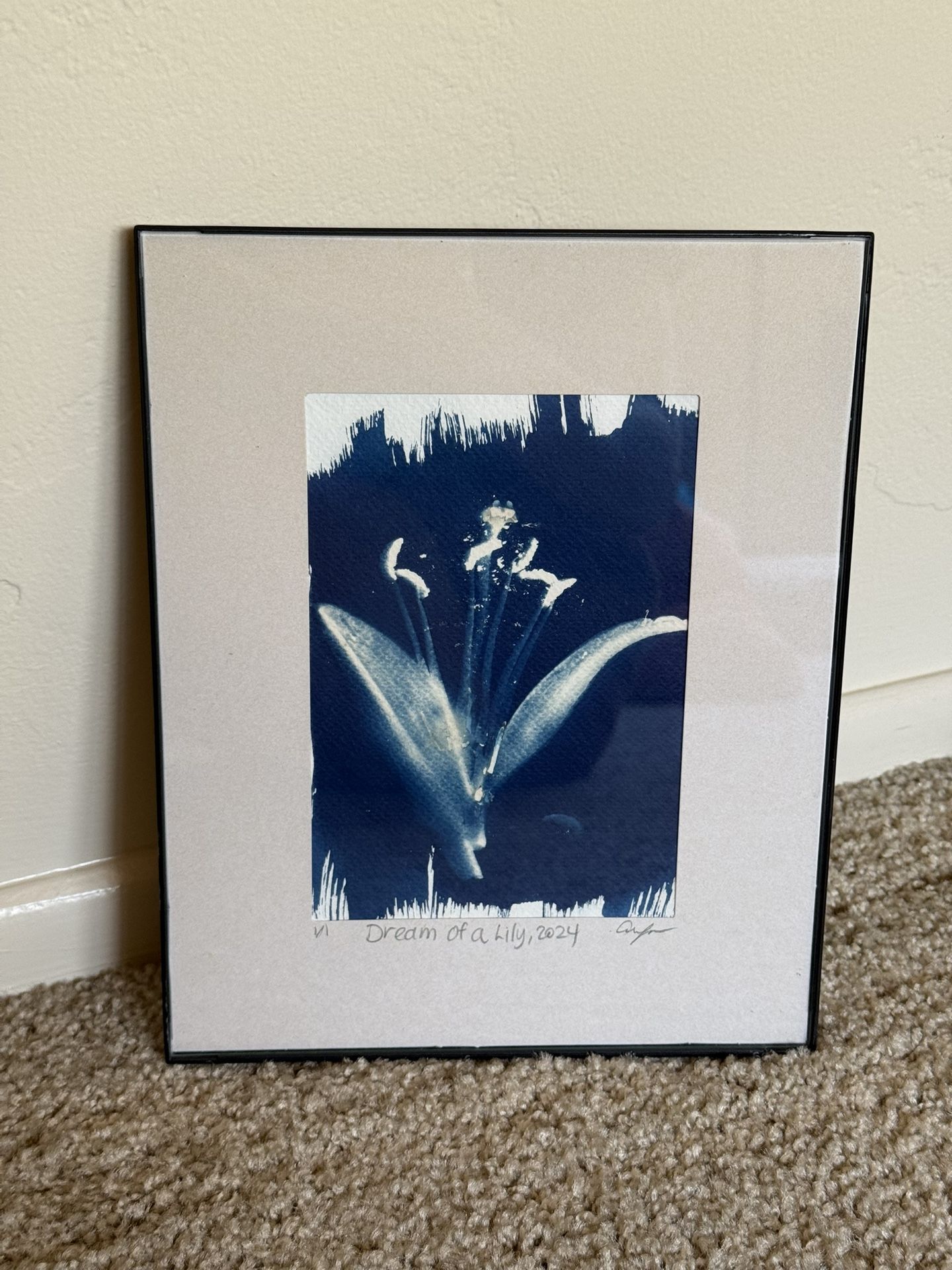 Lily Flower Cyanotype Art Print - original print, not a copy! Skeleton Shadow Cyanotype Art print - original print, not a copy, handmade by me! A Cyanotype, or sun print, is created by using light-sensitive chemicals, an object (such as a flower), and the sun. After exposing the paper to the sun and rinsing it, it becomes a beautiful blue color. The print is 5x7” in a 8x10” frame.