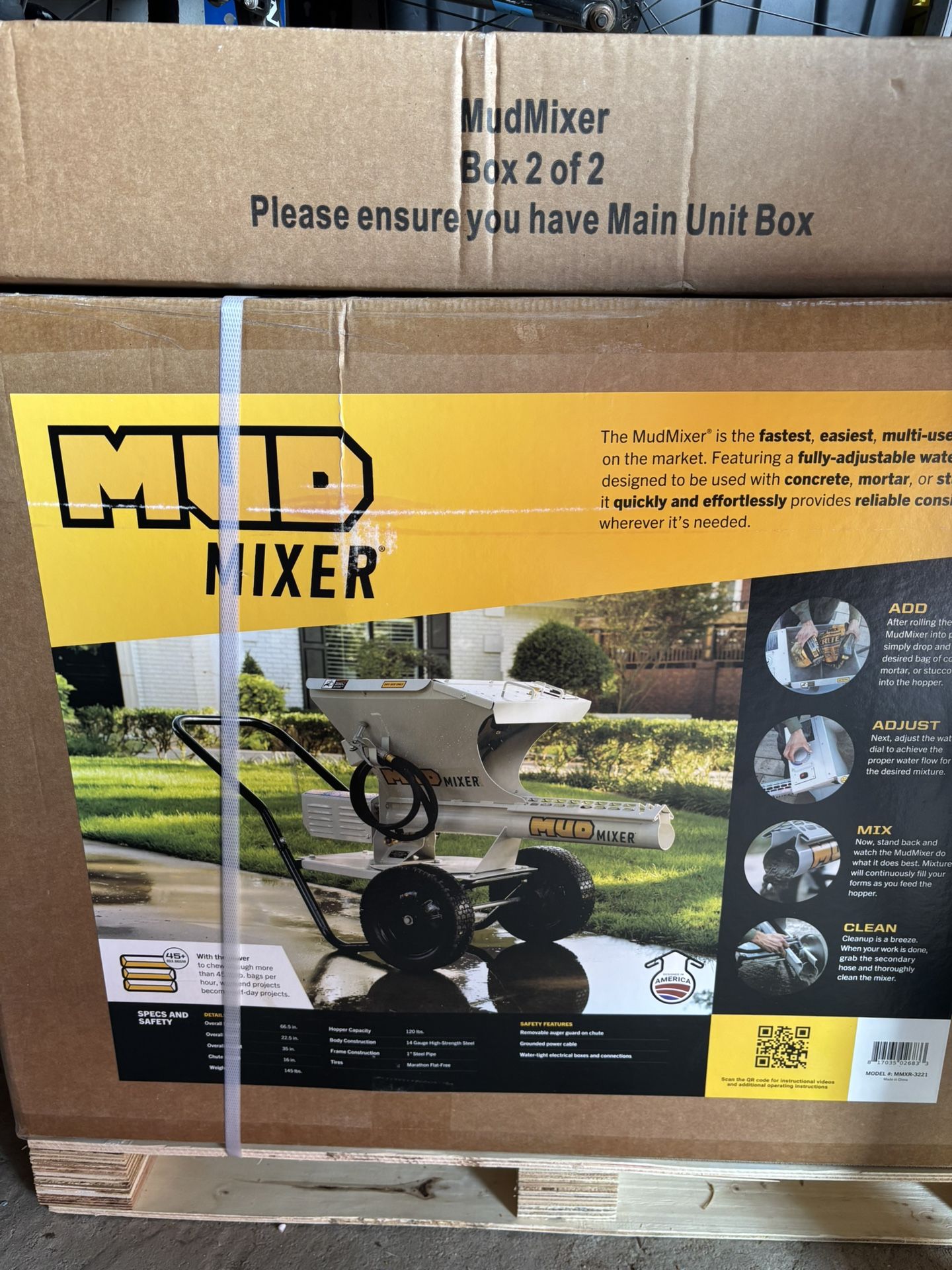 Item is brand new in box, never used. Electric drivetrain has the ability to chew through over 40 - 80 lbs. bags an hour 1/2 HP water-sealed electric motor with forward and reverse operation 330° swivel movement allows for precision placement of cement Integrated bag opener makes it easy to drop-and-fold the bagged cement Revolutionary fully adjustable water dial allows for customized water flow for use with concrete, mortar, stucco mix, pool krete and much more Fits through a gate opening at only 27.5 in. wide Built on a heavy-duty 14-Gauge steel frame set on marathon flat-free wheels Attached hose and nozzle allow for easy cleanup Optional hopper and chute extensions are available No more batch mixing with MUDMIXER's continuous mixing technology Enables reliable material consistency - put an end to too soupy or too dry mixes Saves time and money - cut your workload by more than half Turn 3-4-man jobs into 1-man jobs Improves jobsite safety - easily set cement into hopper without struggling to empty pre-mix bags 35 in. stand-over height means you'll never lift another bag above the belt Effortlessly provides reliable cement mix consistency