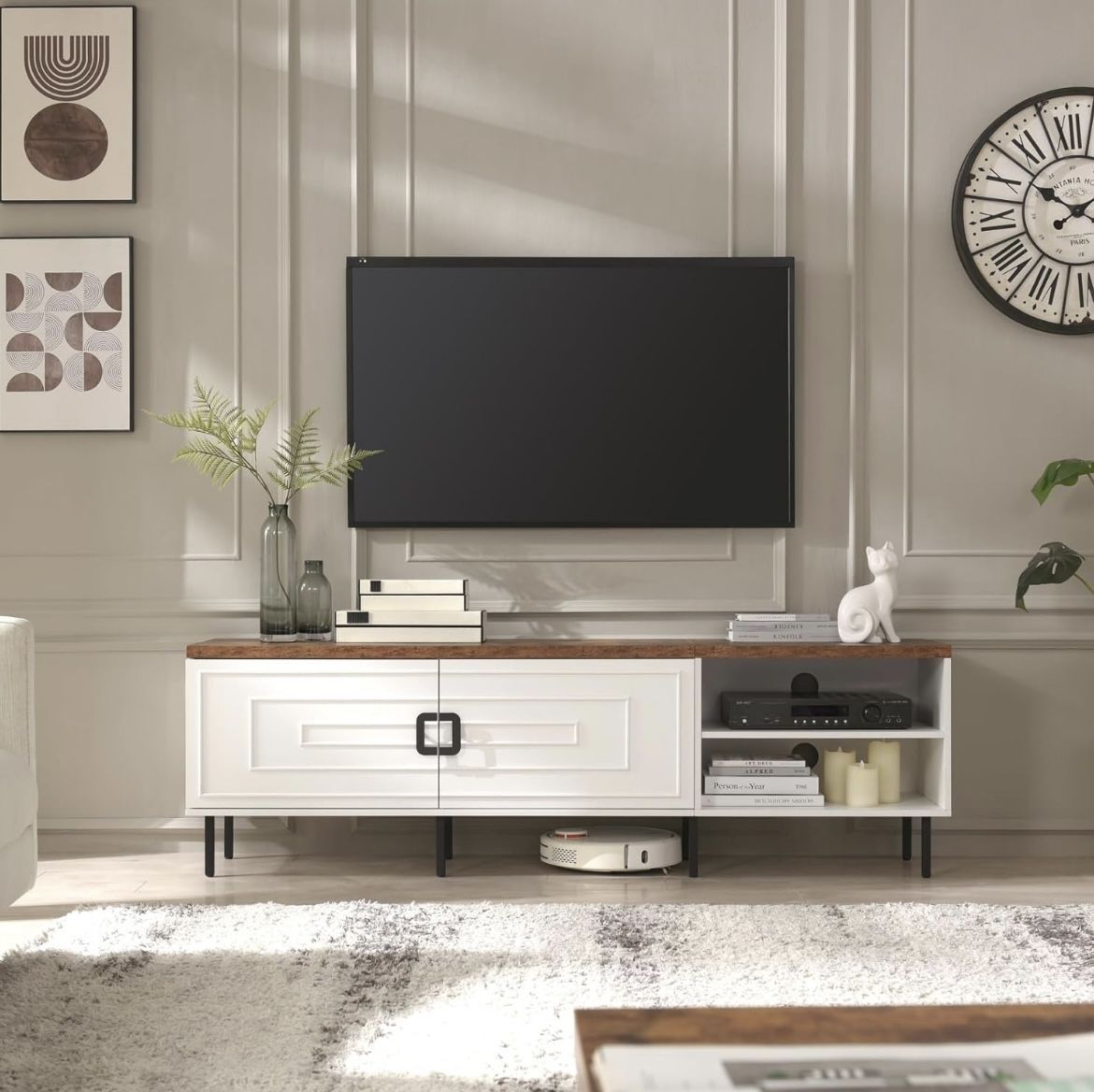 * Brand New Farmhouse TV Stand — Still in Box. The entertainment stand has a dimension of 15.7"D x 70"W x 21.65"H , it's recommended for 50/60/65/70/75/80 inch tvs. Large Storage Space — TV stand with 2 storage cabinets and open shelves for large capacity space. The open shelf and cabinet design has adjustable shelves * Assembly required , instructions included * Box is also heavy and large and will require additional assistance and larger vehicle. (Picture included for reference )