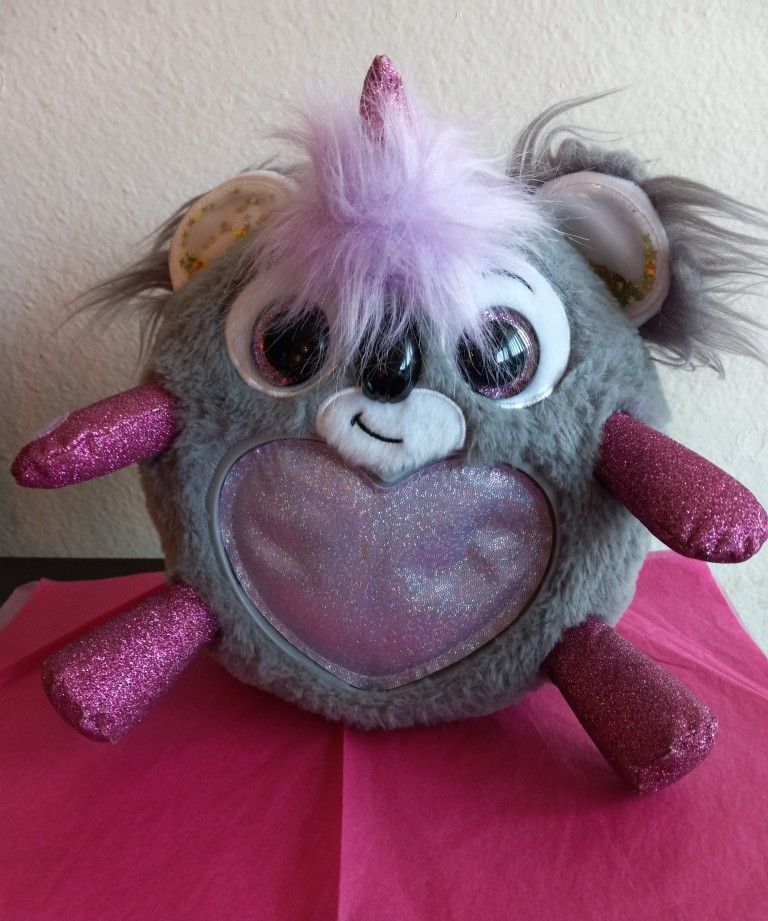 Adorable! Plush that smells like grape, Also has several cute sounds. The sounds are activated when pressing the musical note on its paw
