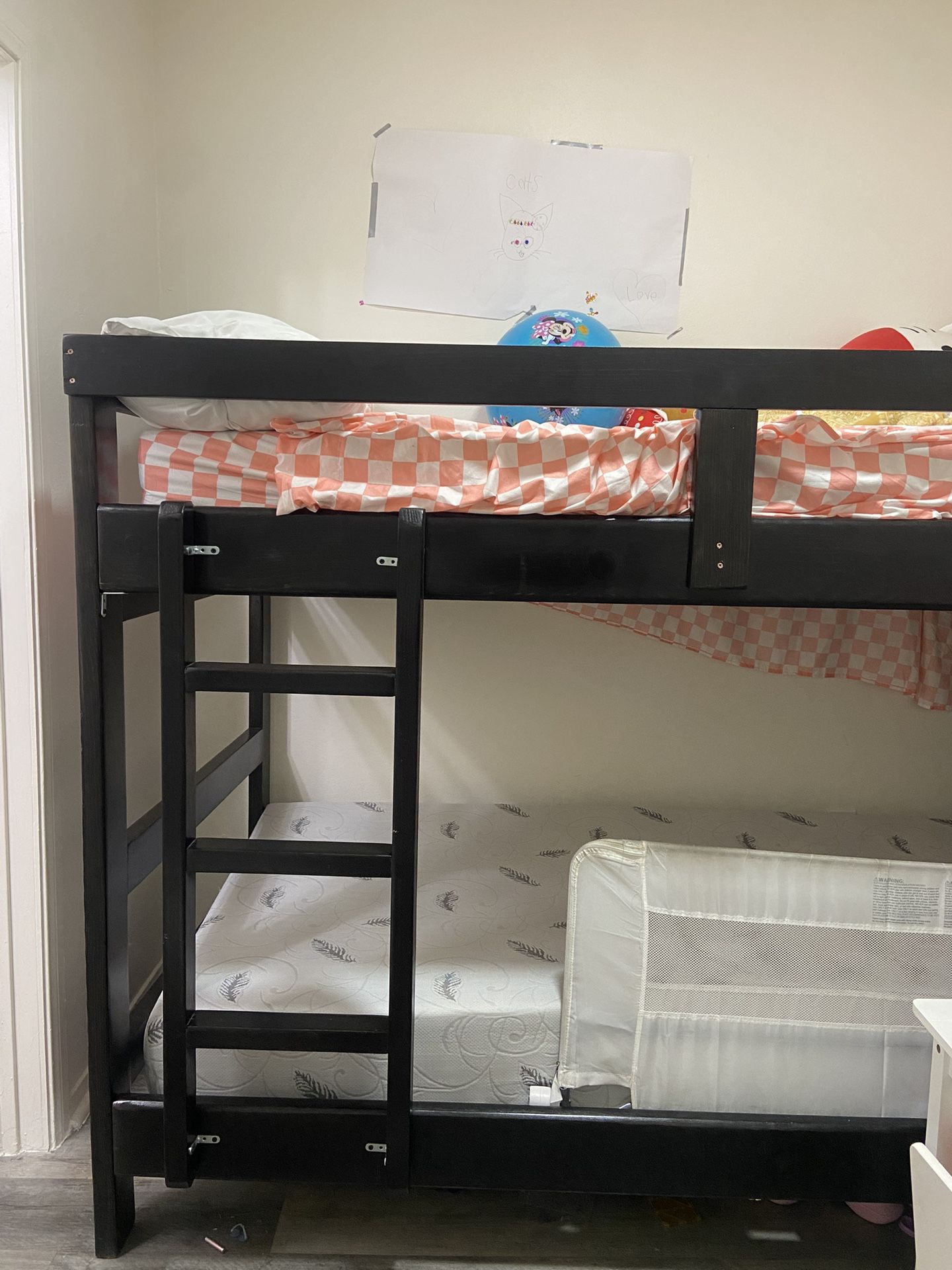 Comes with both mattress HARDLY used , Safety railing not included Must be able to come and pick up / disassemble
