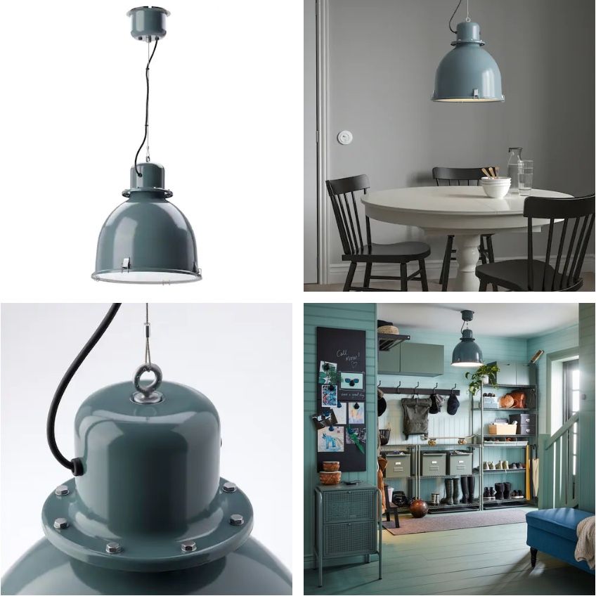 Industrial vibes, blue gray, has a diffuser cover over the light — hard wire into the ceiling