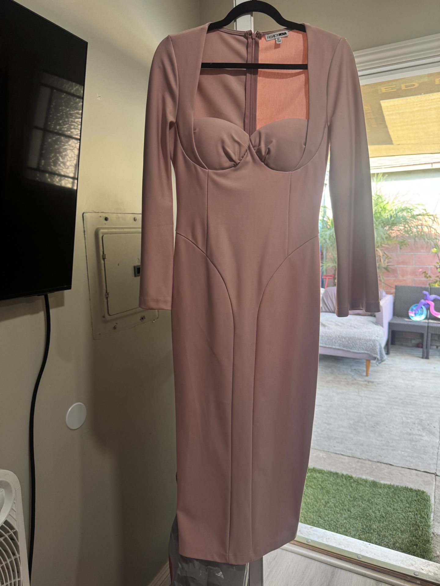 Midi dress, body con like dress but very stretchy Sleeves are bell like sleeves. Worn only once for like 2 hours Zipper works great