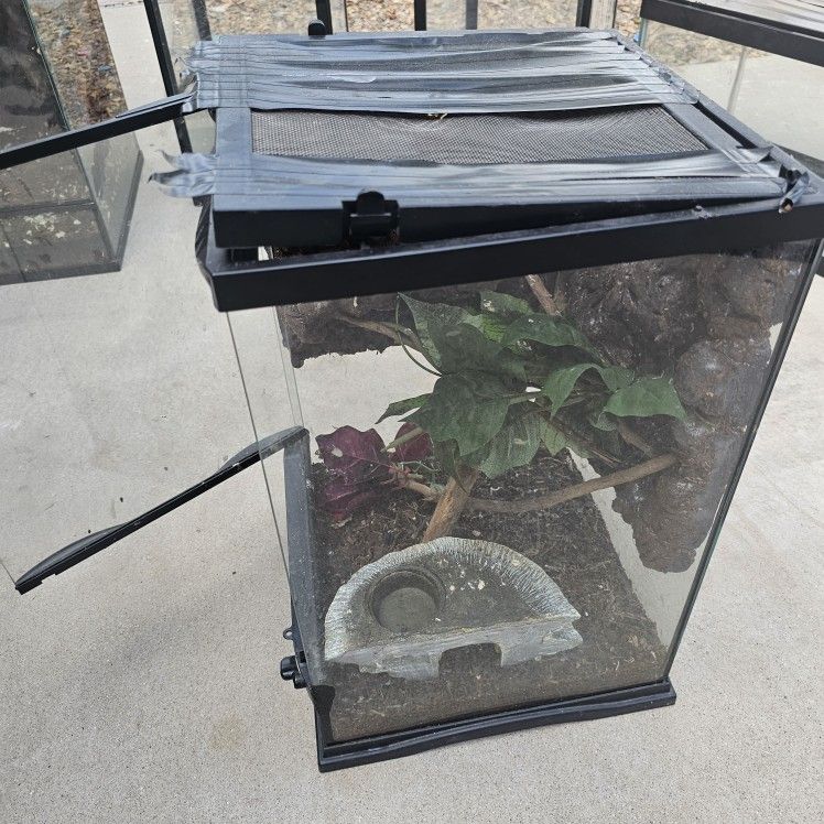 The Tanks available are ✨️2 of the 20g tanks with top lids ✨️1 of the 40g with a sliding top lid ✨️ 1 standing terrarium, front opening, with I think a drain system, about 30g ✨️ 1 standing terrarium about 10-12g. And a new one, roughly about 60-65 gallons (50lx22hx14w) long way tank with a folding lid that I used as a tall standing terrarium. If you're interested, send me your best offer