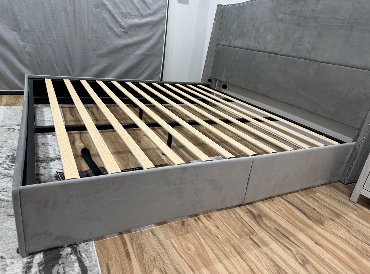 Price: $250 Description: Selling a brand new king size bed with a stylish grey upholstered frame. Perfect for any modern bedroom. • Size: King • Color: Grey • Condition: Like new • Easy to assemble • Pickup only from Roselle, IL Message if interested