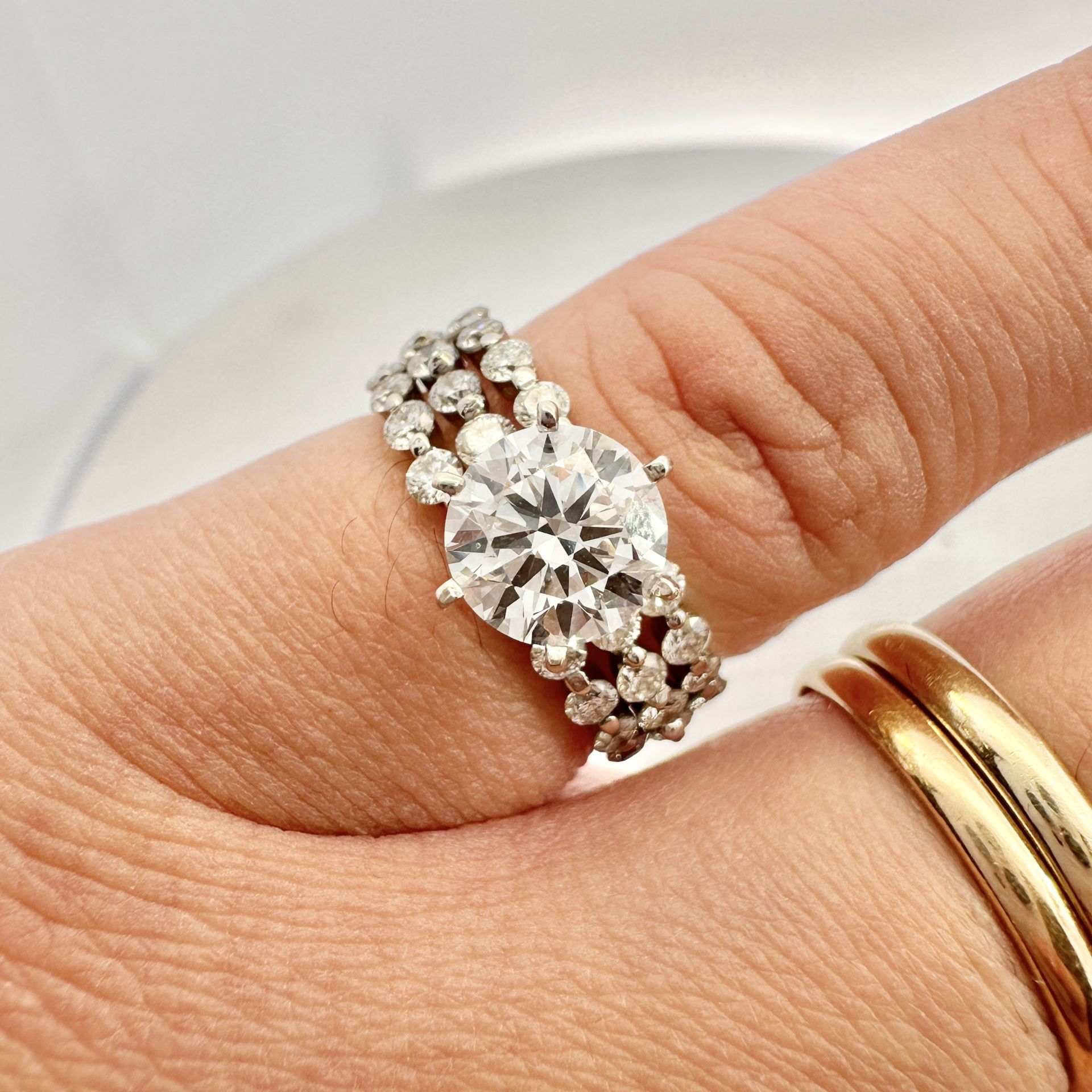 Solid 18K White Gold Lab Grown Diamond Engagement Ring with 1.31 Carat F VS Lab Grown Diamond Center, and 1.27 Cttw. G VS Natural Side Diamonds. Size 6