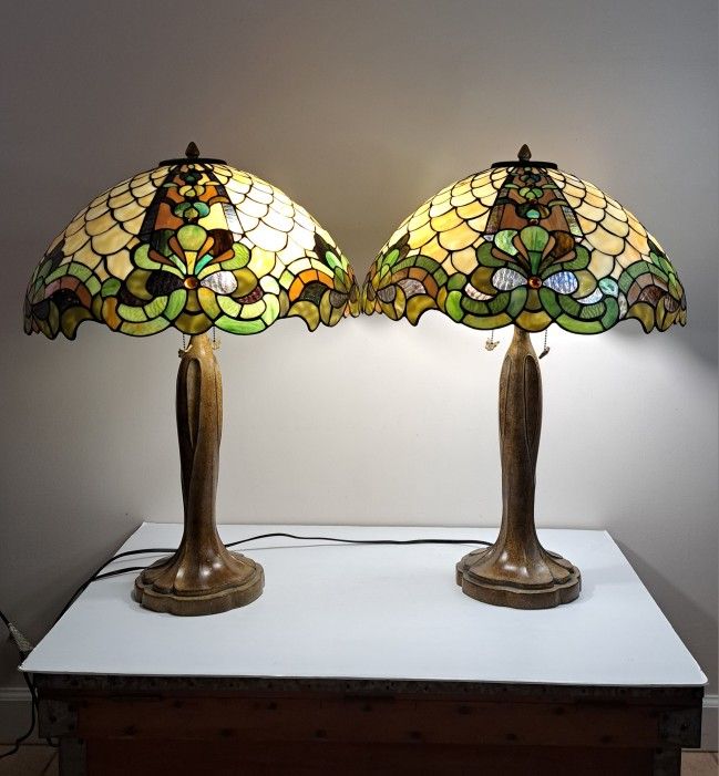Condition Shades: Excellent condition with no cracks, chips, or missing glass segments. Bases: Traditional decorative bases with a carved design and warm brown finish, likely cast resin. Light surface wear and small scratches from normal use, but no structural damage. Electrical: Each lamp uses two standard bulbs and features dual pull‑chain sockets, allowing you to light one or both bulbs for adjustable brightness. Both lamps are tested and working. Measurements (Each Lamp) Height (to finial): 29 in. Base Diameter: 8 in. Shade Diameter: 20 1/4 in. Shade Height: 10 in.