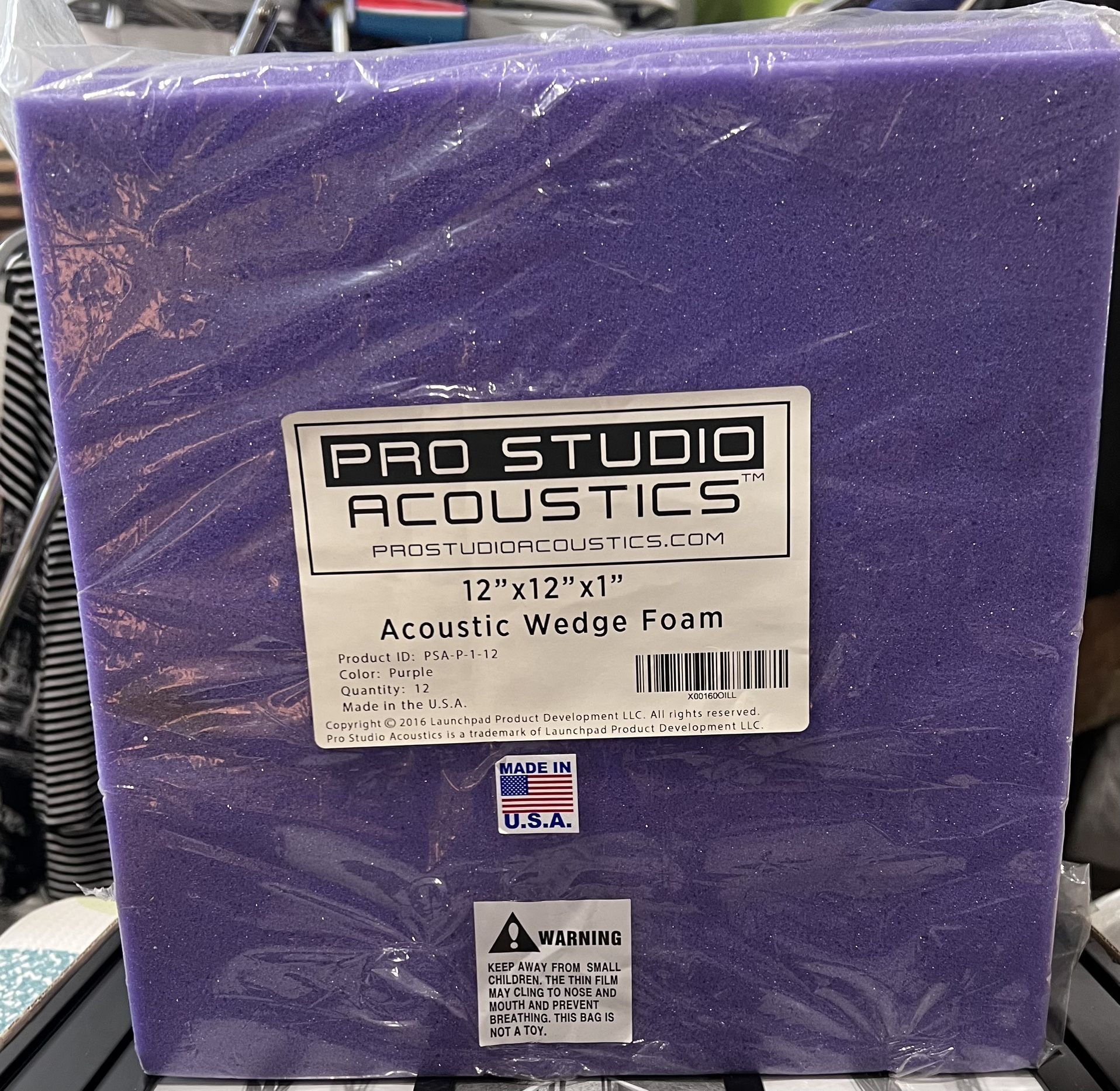 Pro Studios Acoustic Panels. 12” x 12” x 1” acoustic wedge foam tiles. Quantity is 12. Color is purple.