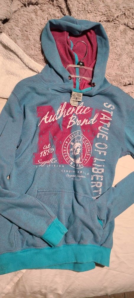 This is a surprisingly warm bright blue and mauve HOODIE that can be cuffed at the sleeve to add detail or worn as is. Soft and warm inside