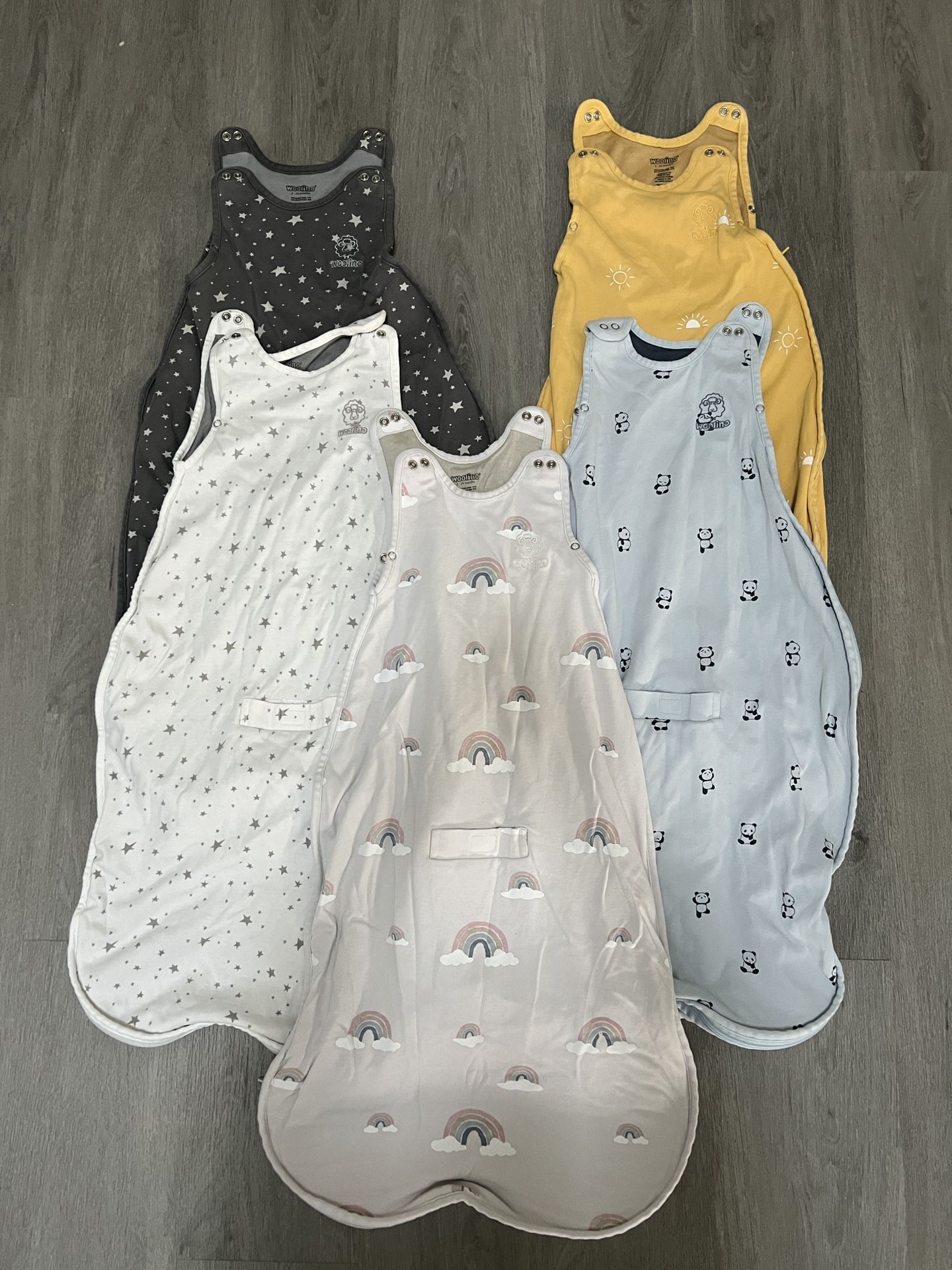 5 Woolino sleep sacks, size 2-24 months. -Grey with white stars -White with grey stars -Rainbows -Blue with panda bears -Yellow sunshines $100 all together or $20 each.